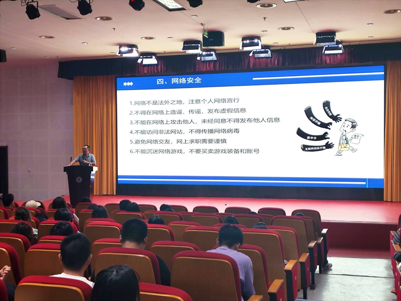 金杰老师强调,宿舍是同学们学习生活的重要空间,宿舍良好的环境需要宿舍同学共同维护。金杰老师从宿舍卫生、宿舍用电安全以及宿舍查寝等方面,强调宿舍长要把责任担在肩上,在集体中发挥先锋模范作用。王志明处长以安全教育作为切入点,从消防安全、人身安全、财务安全以及防范电信网络诈骗等多个角度,提醒同学们发生安全事故时,舍友之间要相互帮助,培养集体主义观念。最后,大会邀请冯陆芊和周阳两位五星宿舍的宿舍长和同学们分享日常宿舍卫生打扫以及和宿舍成员间的相处之道,共同建设一个文明、和谐、美丽的宿舍环境。