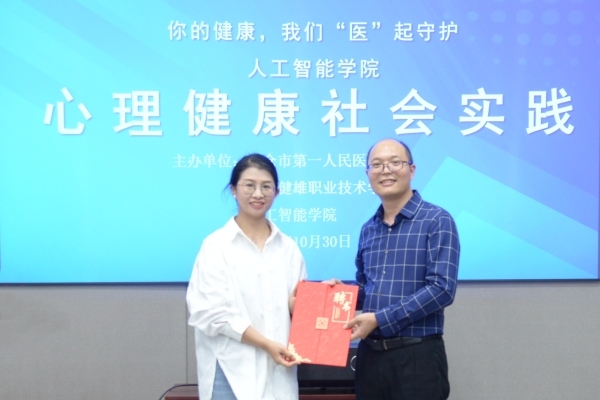 活动中,同学们受邀参观了市人民医院的宣传文化长廊,充分了解了市人民医院的基本情况、发展成就和未来规划。人民医院的汪海芸护士长还为同学们带来了主题为“如何提升青年的心理健康水平”的专题讲座。汪护士长指出,对青年大学生心理健康的关注,不仅是现代社会文明进步的表现,是社会助力青年大学生拥抱健康心理,阳光成长,快乐生活的起点,更是青年大学生取得学业进步,创造美好生活,发展和成就事业的基石,她从心理健康的定义,大学生心理健康常见的问题、如何正确面对心理问题、如何处理心理健康问题等方面详细讲解了心理健康的知识和实践方法,鼓励同学们用爱心、舒心、开心、耐心、细心、“粗心”的心态面对人生中的不同问题,走出情绪困惑,拥抱乐观生活。活动现场,人工智能学院为7位心理专家颁发了“心理健康校外辅导员”聘书。