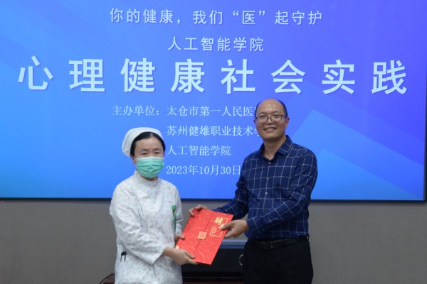 为更好引导大学生积极阳光面对人生,拥抱健康心态,10月30日下午,人工智能学院联合太仓市第一人民医院开展了大学生心理健康社会实践活动。太仓市第一人民医院党委副书记孙亚军、党政办公室主任祁富伟、汪海芸等7位心理健康专家,苏州健雄职业技术学院党委委员、副院长吴建洪,人工智能学院党总支副书记陈东生,人工智能学院辅导员罗毅、姜来、周敏新、律心同出席本次活动。