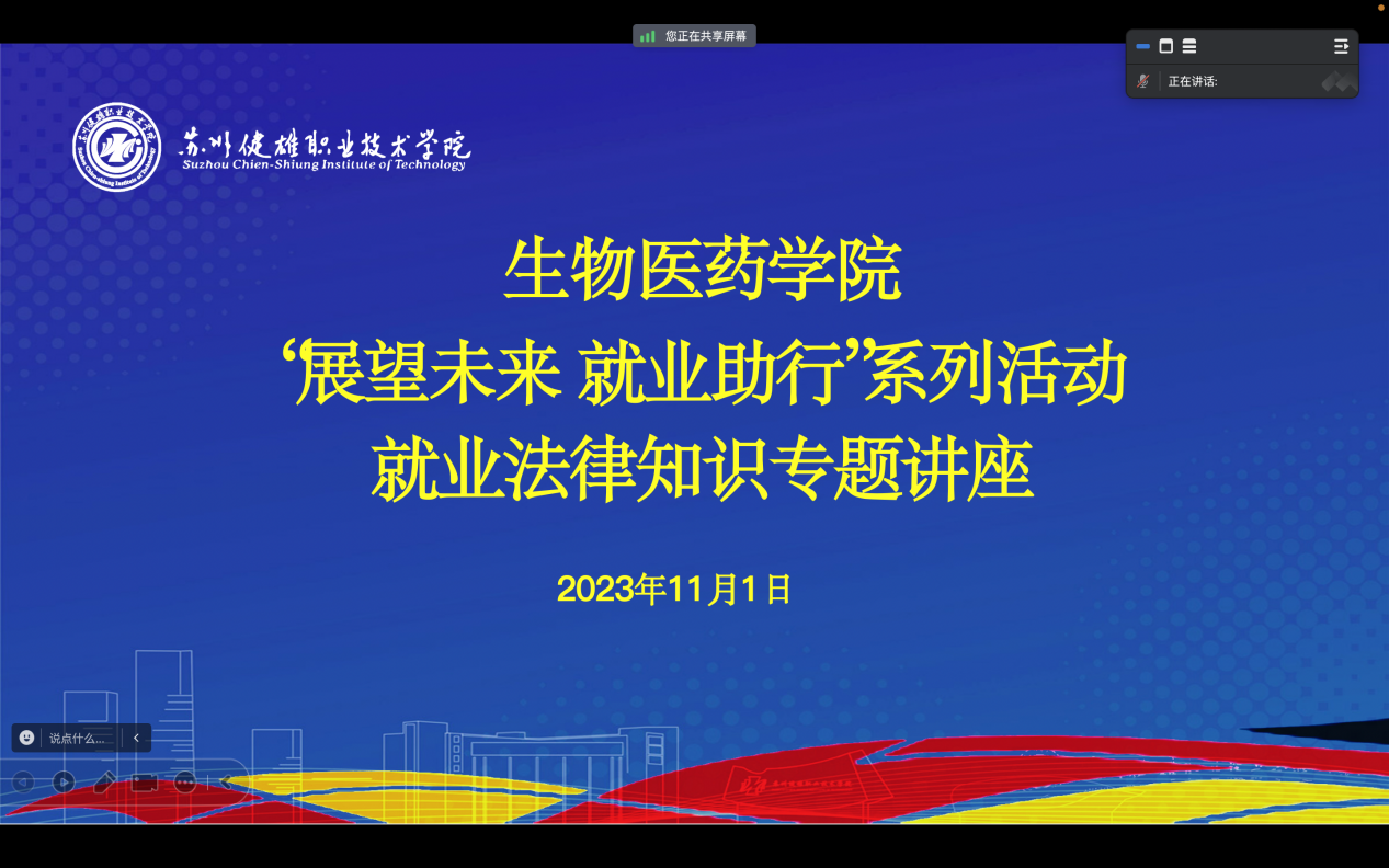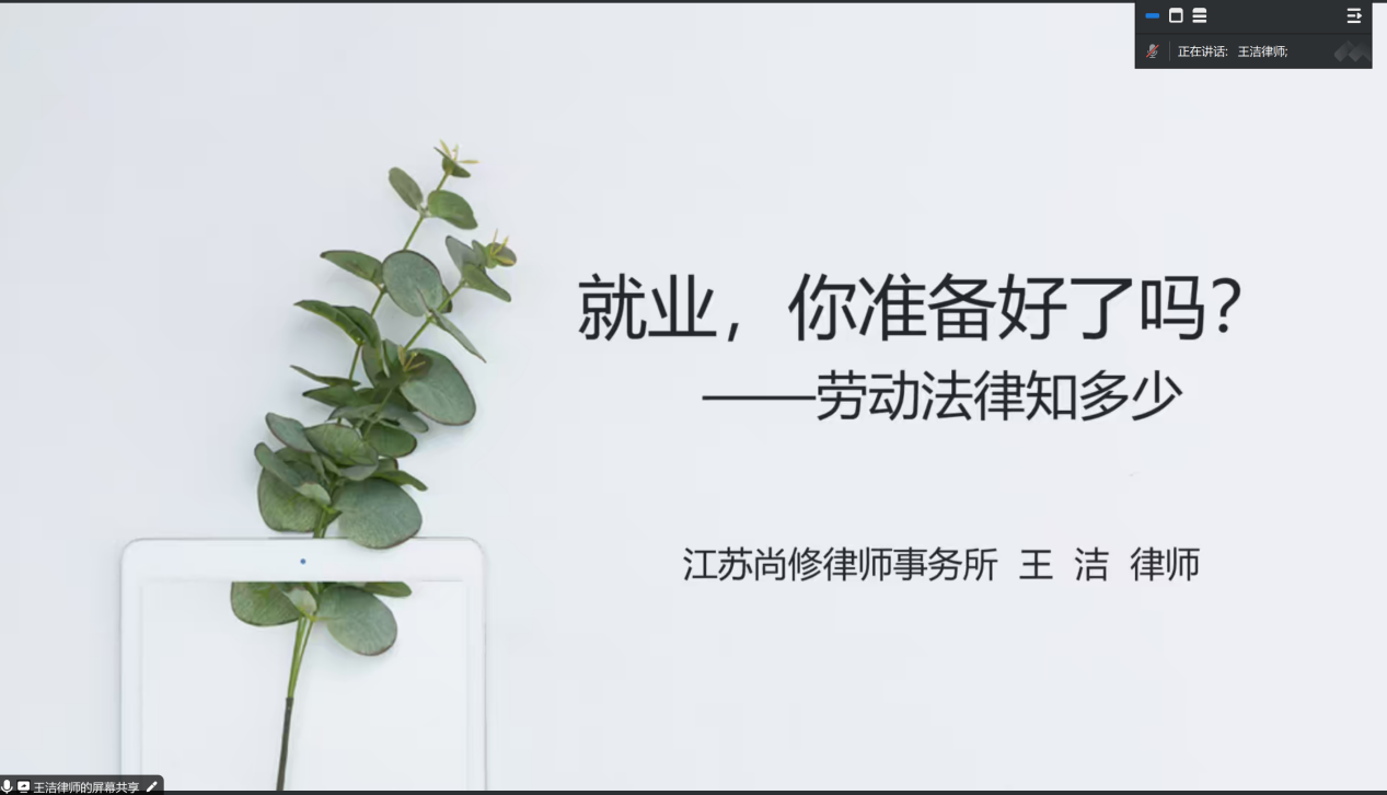 为了进一步强化同学们的法律意识,规避在实习就业中可能遇到的法律风险,11月1日晚,生物医药学院举办“展望未来,就业助行”系列活动之就业普法讲座。本次讲座邀请江苏尚修律师事务所执业律师王洁作为主讲人,全体2021级学生参与本次线上讲座。