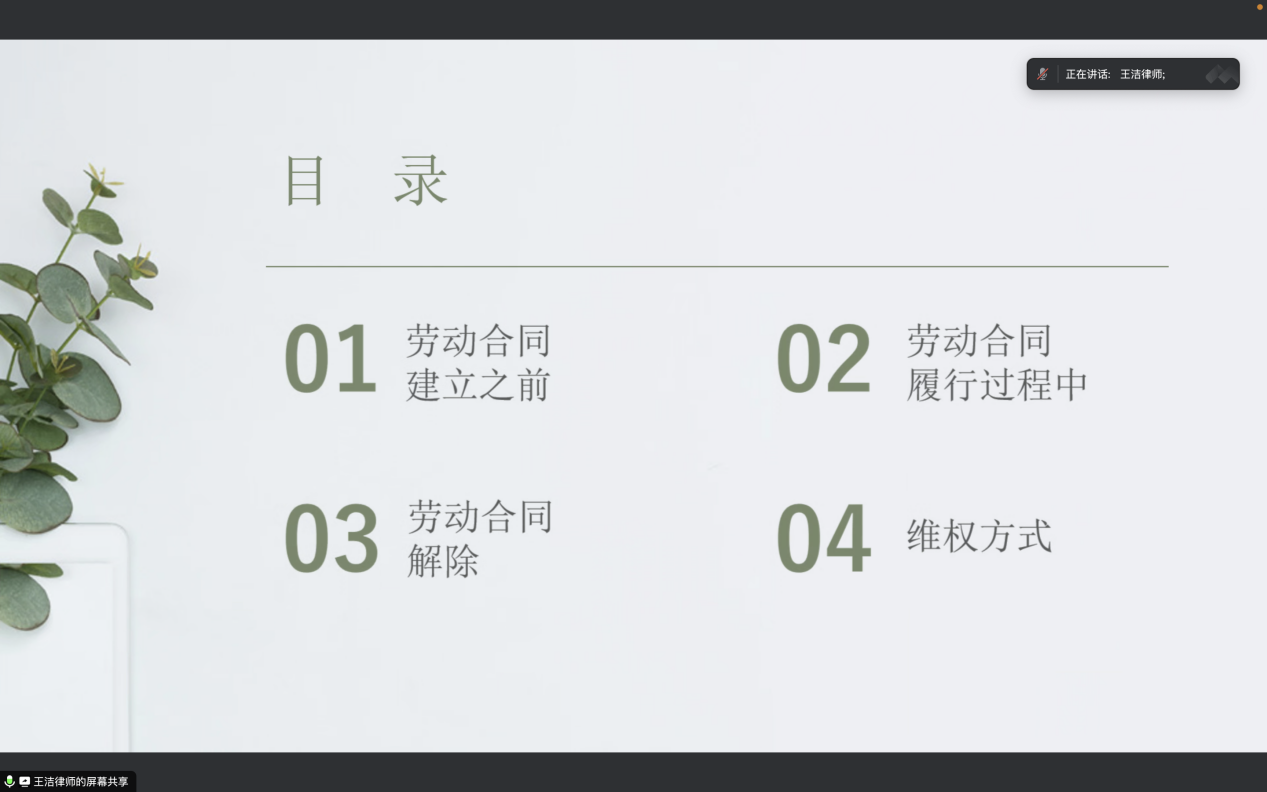 王洁律师分别就个人工资,调岗降薪,劳动合同解除,解除的类型,劳动者有因单方面解除,用人单位过错性解除,用人单位无过错性解除以及我们如何能维护自己的合法权益作了深度讲解,并指明实习时如何预防被骗的措施,针对实习,她指出,一要懂得维护自己的个人权益,二要一定要清楚了解知道劳动合同上约定的内容,三要清楚知道劳动合同如何解除,解除的类型,四要知道维权的途径。