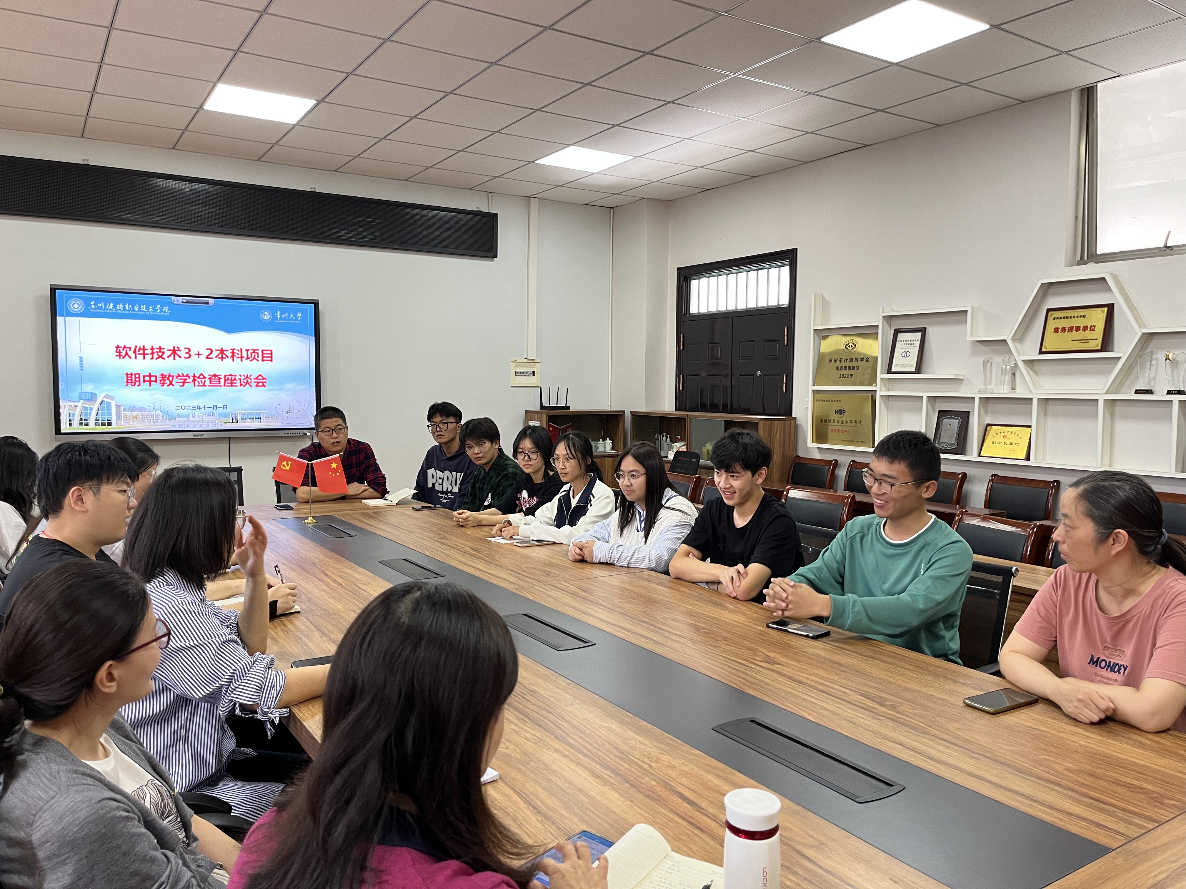 座谈会上首先由章朋院长向学生介绍了软件技术专业的办学情况,特别是23年刚招收的本科3+2专业和常州大学联合办学以及其转段考试的要求做了说明,吴伶琳老师对本次座谈会的目的和要求进行了补充。