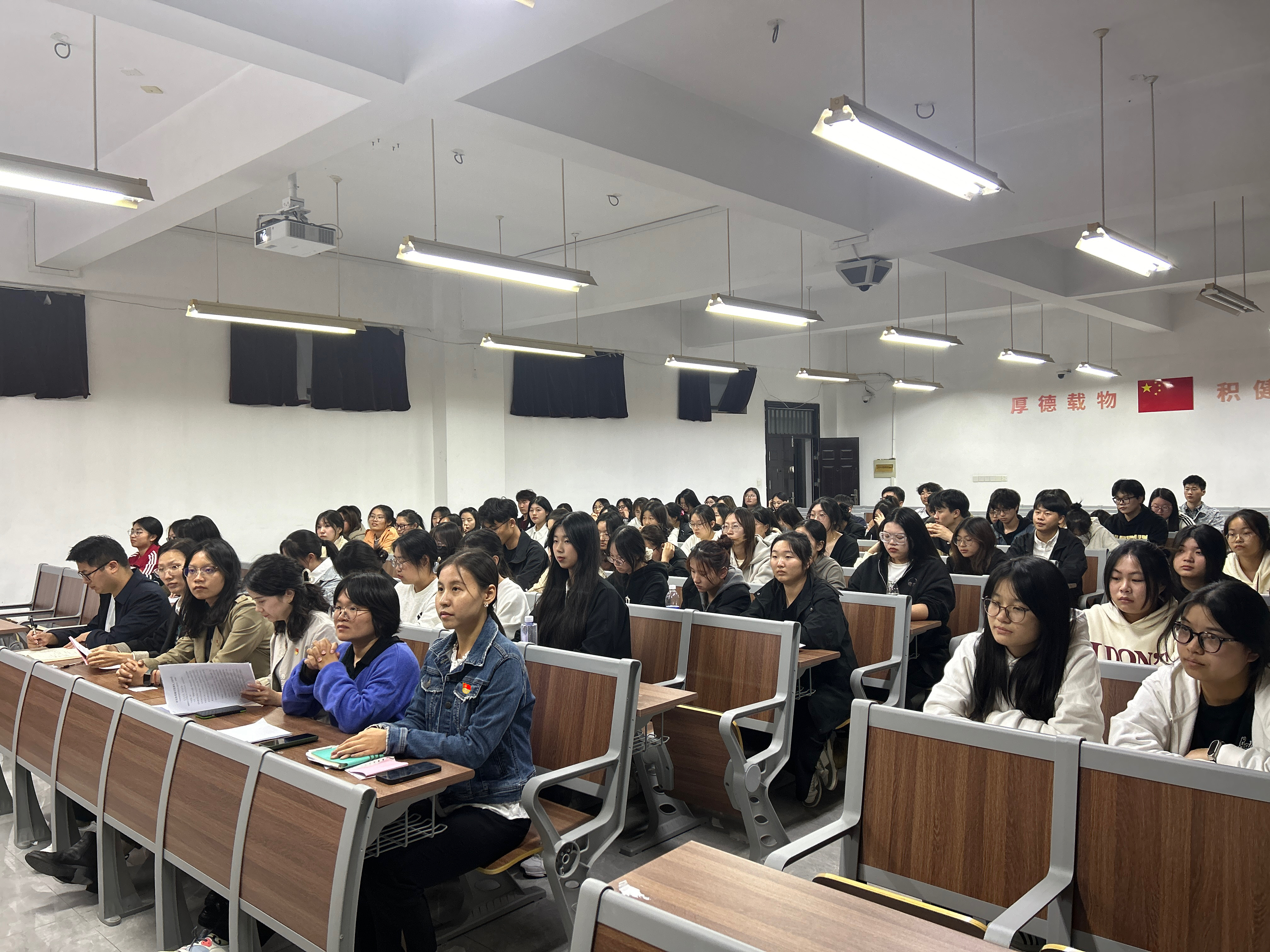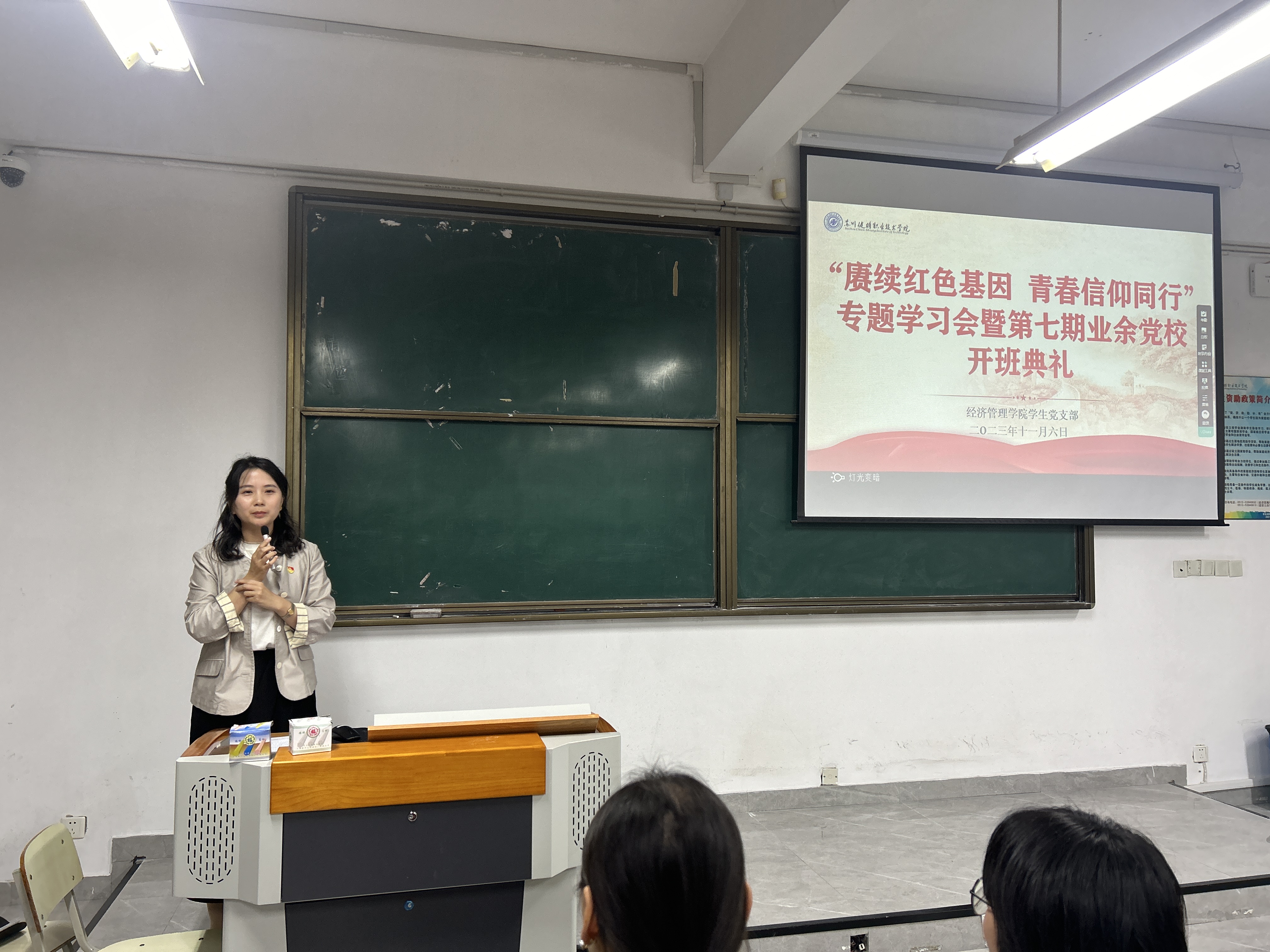 2023年11月6日晚,经济管理学院在C3-301举办“赓续红色基因 青春信仰同行”专题党课暨第七期业余党校开班典礼。学院党总支副书记沈晓婷、2023级全体新生辅导员以及95名积极向党组织靠拢的青年学员参加了此次开班仪式。本次开班典礼由学生团总支副书记龚欣妍主持。