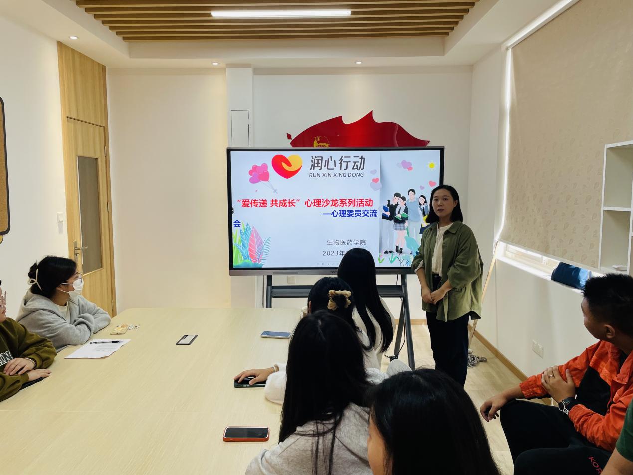 为贯彻落实江苏省教育厅《关爱青少年生命健康“润心”行动实施方案》的通知文件精神,进一步加强大学生心理健康教育工作,11月8日下午,生物医药学院在紫薇社区举办了“爱传递 共成长”心理沙龙系列活动之心理委员交流会,会议由学院心理辅导员李慧老师主持,全体心理委员参加了本次活动。