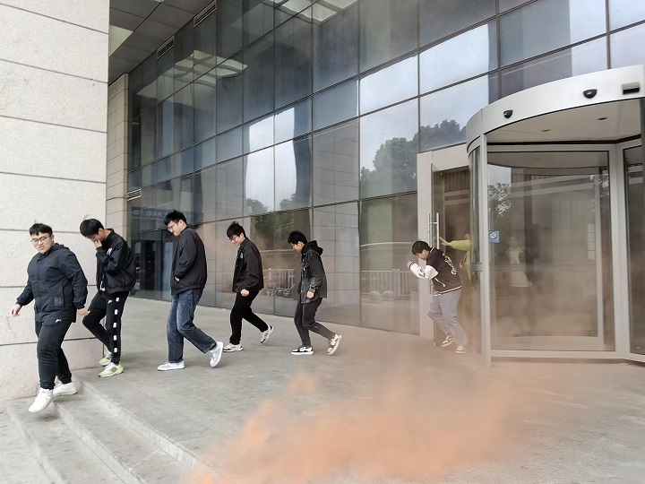 上午11:30,随着消防烟雾弹的释放和防空警报的响起,现场辅导员和引导员迅速到达指定位置,引导各楼层学生安全、快速撤离。菁英公寓住宿生在老师们带领下捂住口鼻,弯腰从安全通道紧急疏散,快速有序地撤离到菁英公寓前广场,整个过程仅用时约5分钟。