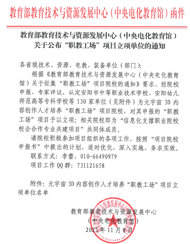 由艺术设计学院数媒团队杨晓琳老师牵头,联合人工智能学院共同申报的教育部教育技术与资源发展中心(中央电化教育馆)元宇宙3D内容创作人才培养“职教工场”项目获批立项。