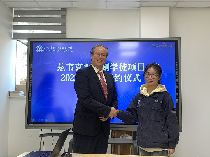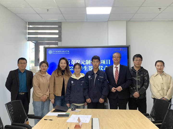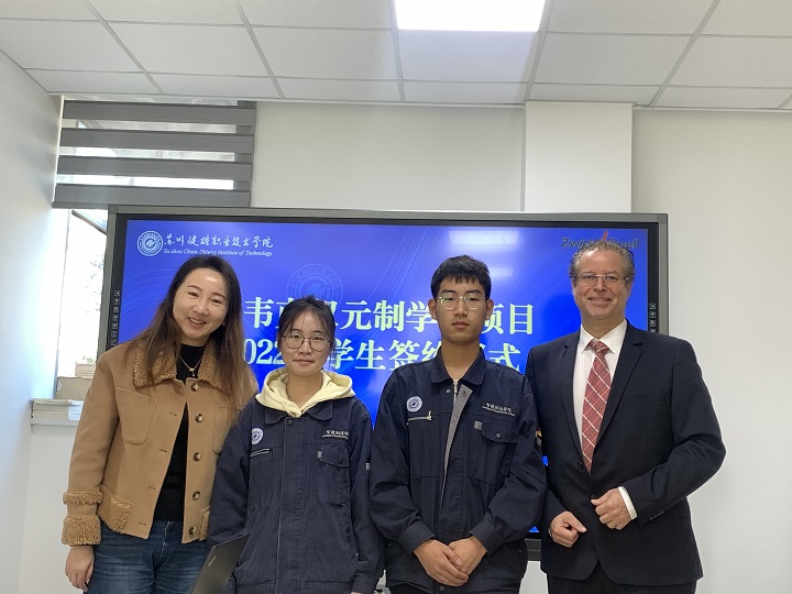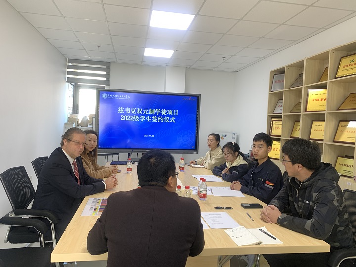 11月22日上午,我院与兹韦克双元制学徒项目2022级学生签约仪式在东校区D1-203会议室举行,兹韦克中国区首席执行官Christian Wiese、人事经理章倩、智能制造学院机电专业负责人汤雪峰、校企合作专员李之繁和辅导员刘惠杰、顾益、两名机电一体化技术专业学生参与签约仪式。