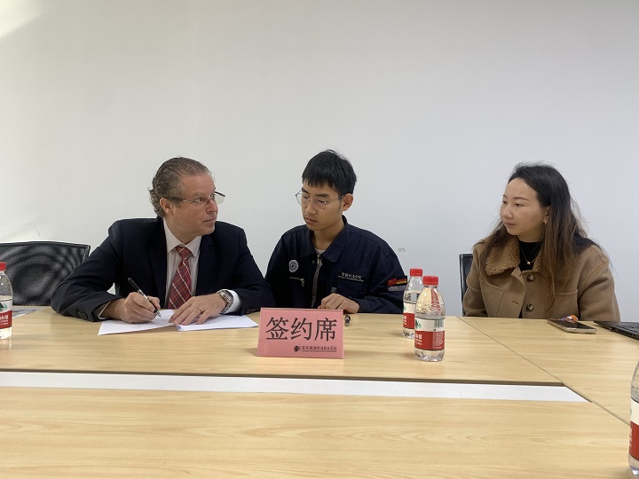 会议开始,李之繁对我院与兹韦克双元制项目建设情况、师资投入、培养模式、职业发展等进行详细解读,特别是协议内双方权益、义务等条文内容做进一步解释说明。Christian Wiese表示双元制的教学模式在德国比较成熟,兹韦克非常荣幸能与智能制造学院开展双元制学徒培养模式,并对两名学徒的加入表示热烈欢迎,希望学生可以和企业共同成长。会议最后,两名学生与Christian Wiese签署学徒培养协议并合影留念。