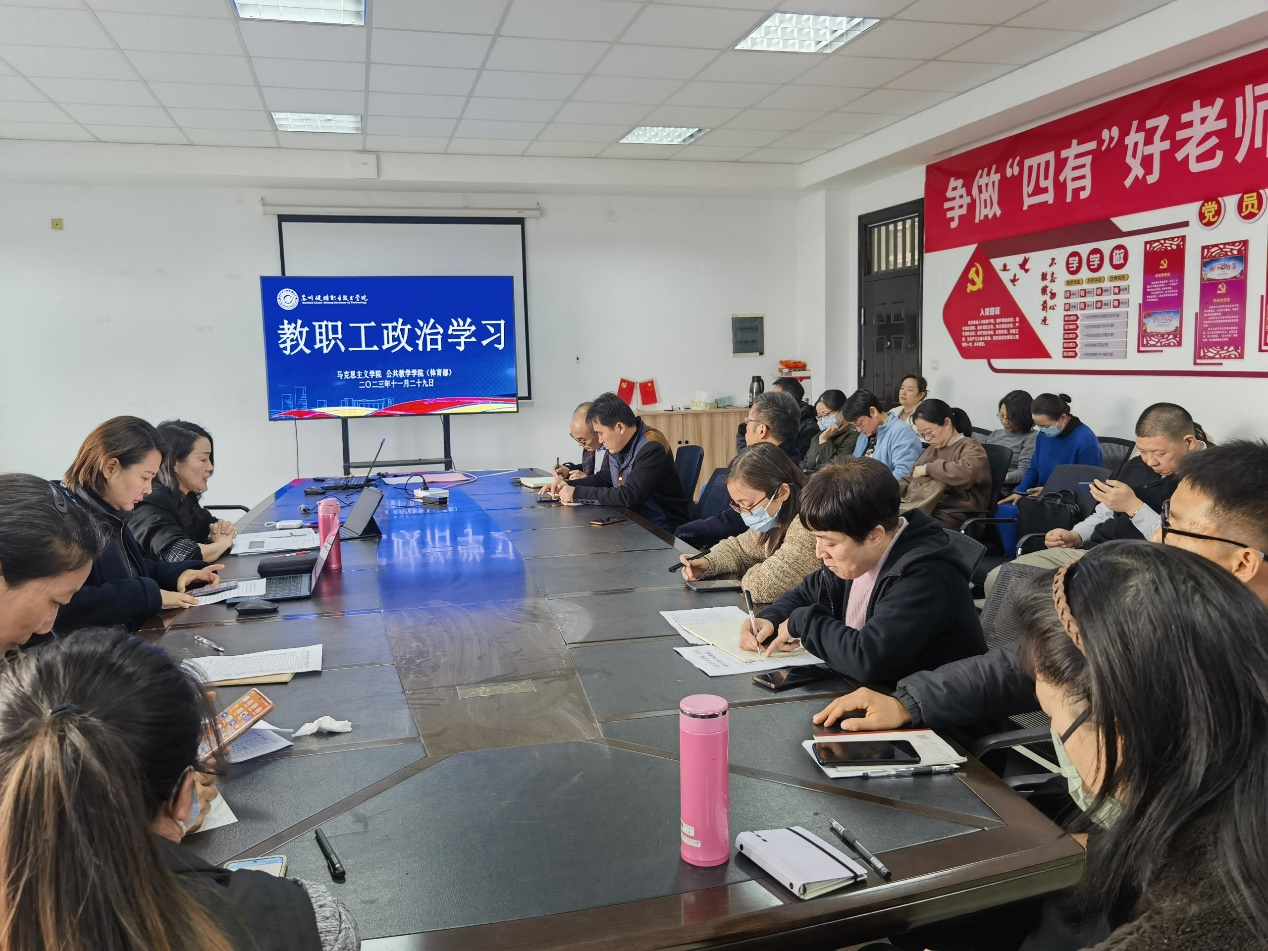 11月29日下午,马克思主义学院、公共教学学院(体育部)在C1-202部门会议室,召开全体教职工政治学习会议,学院全体教职工参会,会议由学院(体育部)院长周丽雅主持。