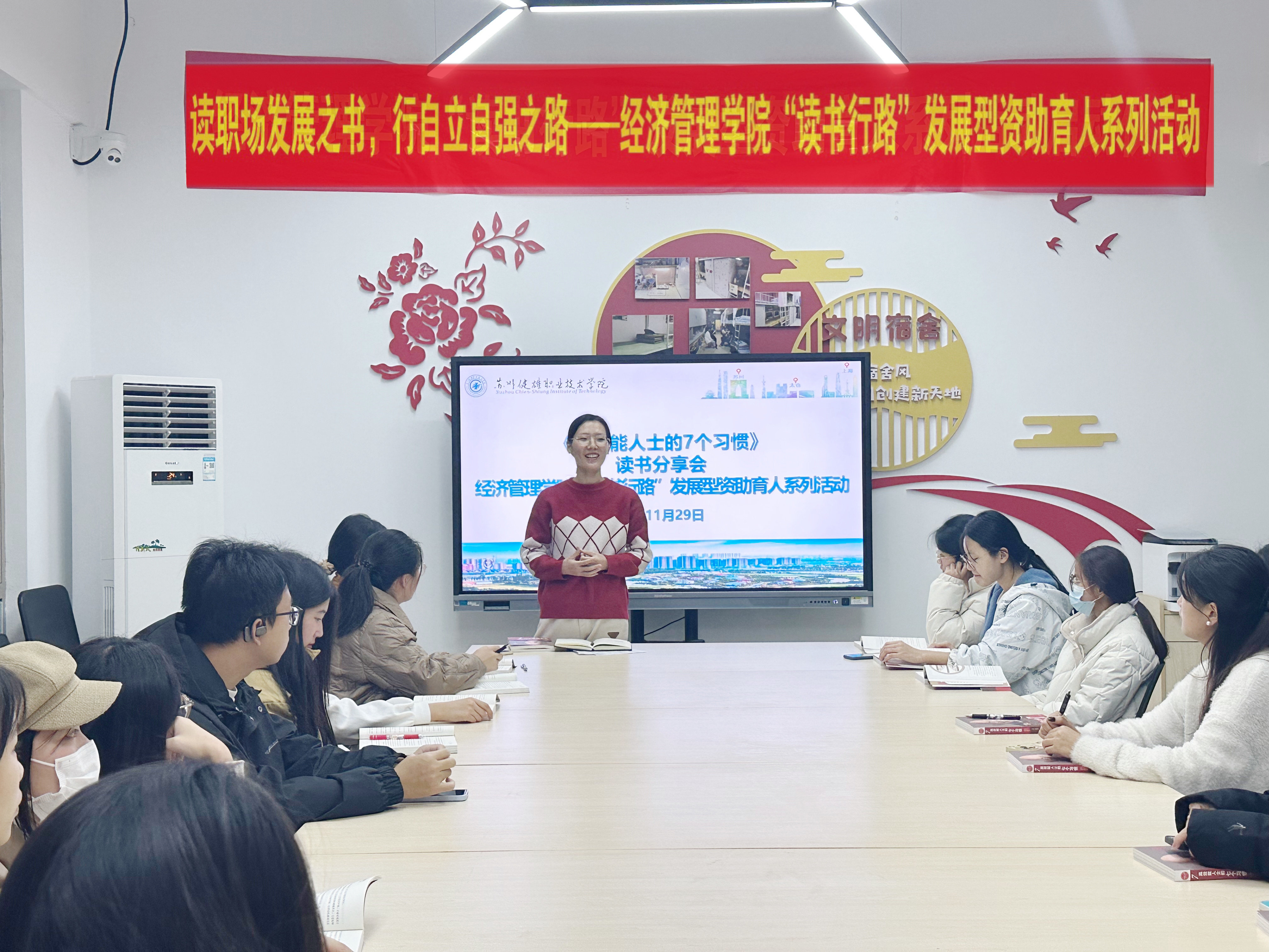 为丰富家庭经济困难学生校园文化生活,培育学生爱读书、读好书、善读书的良好习惯,11月30日晚,经济管理学院“读书行路”发展型资助育人系列活动之第一期读书分享会在紫薇社区活动室开展,活动由辅导员张丽丽主持,22级、23级学生代表参与。