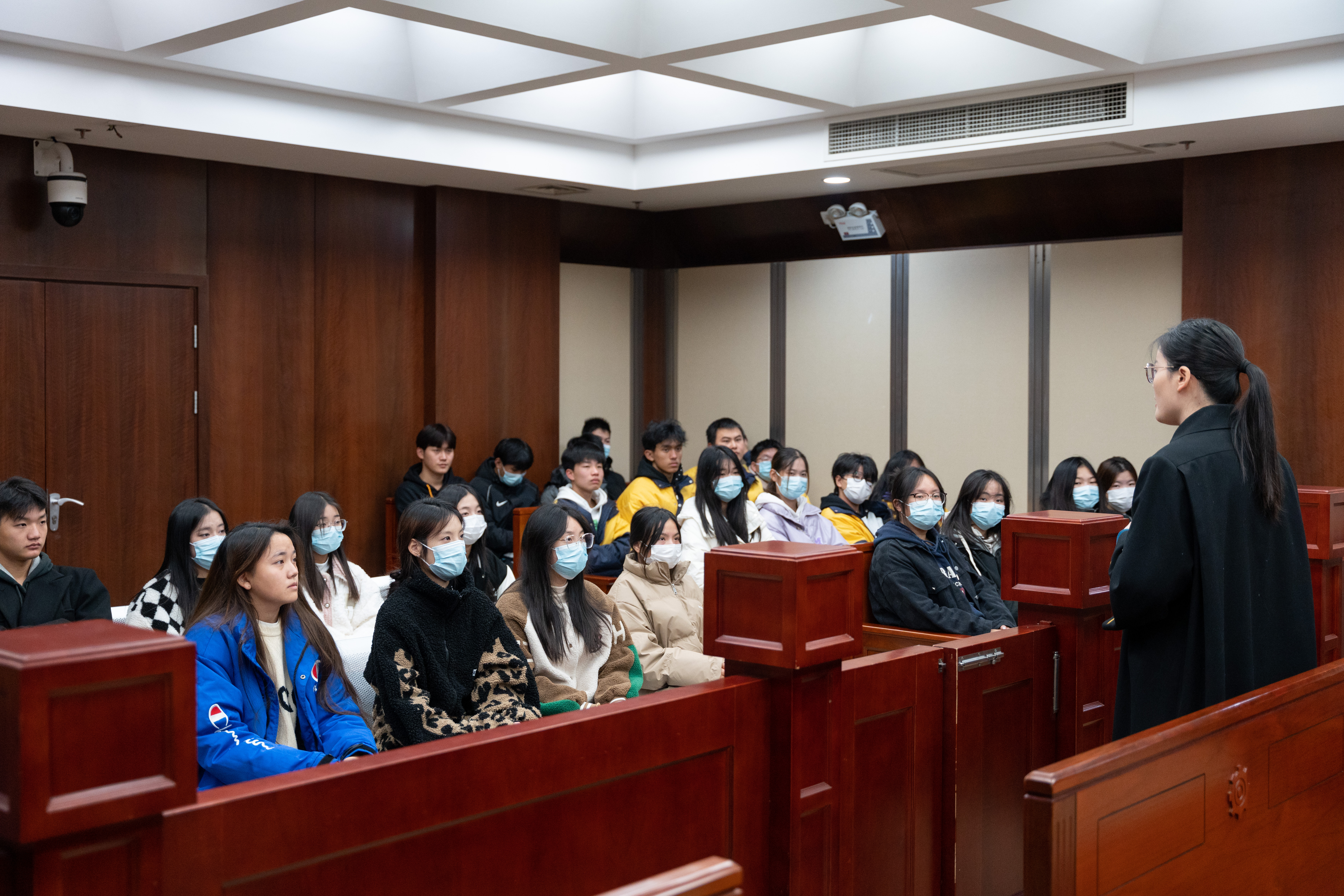 同学们队列整齐,在法院干警的带领下,参观了太仓人民法院法院诉服中心,让同学们了解了多功能智慧诉讼服务系统以及法院安检、立案、受理等诉讼服务流程。接着,全体师生前往太仓市人民法院十一法庭观摩了一场故意伤害案的现场庭审。在法官吴守花法官的讲解下,同学们讲解了法庭纪律、庭审流程和刑法知识,庭审结束后,吴法官对大家提出的疑问一一进行解答。最后,同学们来到“对德合作司法服务工作站”进行参观,民二庭法官助理王迪向同学们介绍了太仓市人民法院在处理涉德企诉讼纠纷以及服务对德合作工作中的一系列成果,让同学们更全面的了解法院的工作内容。