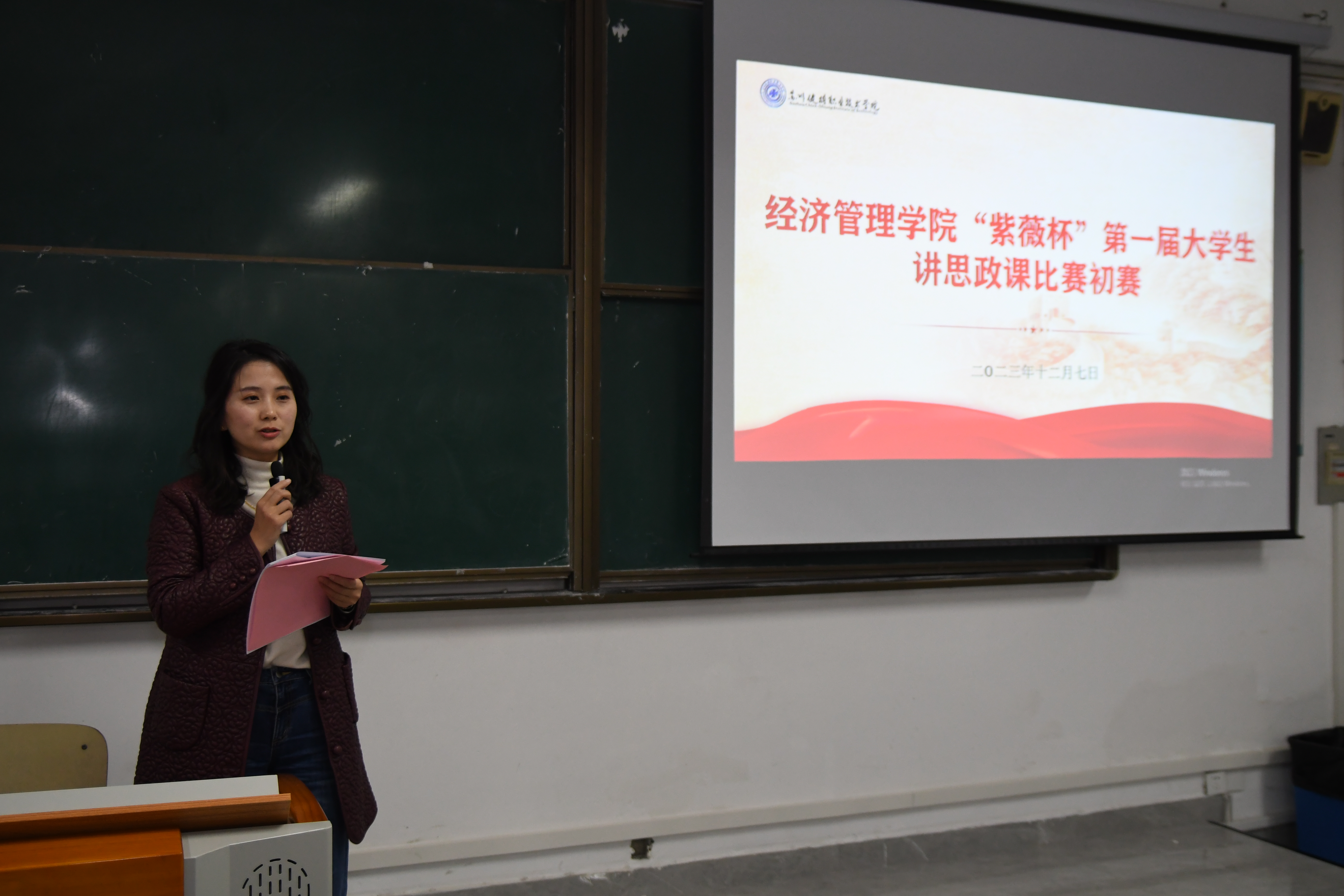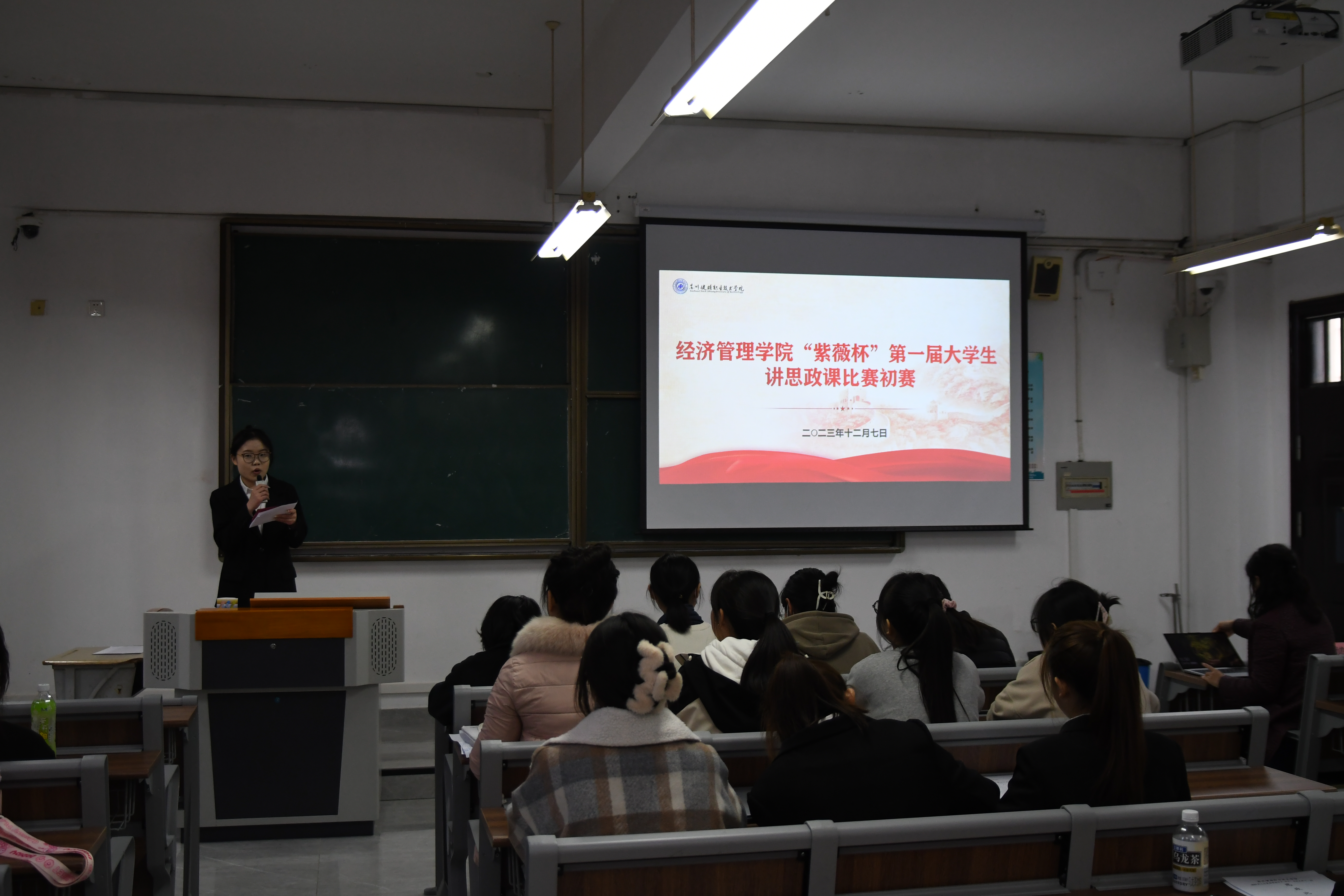为贯彻落实习近平总书记关于深化思想政治理论课改革创新的重要讲话精神,充分发挥思政课立德树人关键课程作用,坚持不懈用习近平新时代中国特色社会主义思想铸魂育人,引导学生在“大思政课”中受教育、长才干、作贡献,坚定不移听党话、跟党走,近日,经济管理学院在C3-205举行“紫薇杯”第一届大学生讲思政课比赛初赛,经济管理学院党总支副书记沈晓婷,辅导员王超慧、顾子琪、步滕滕、张丽丽老师作为评委出席,本次比赛由团总支(学生)副书记龚欣妍主持。