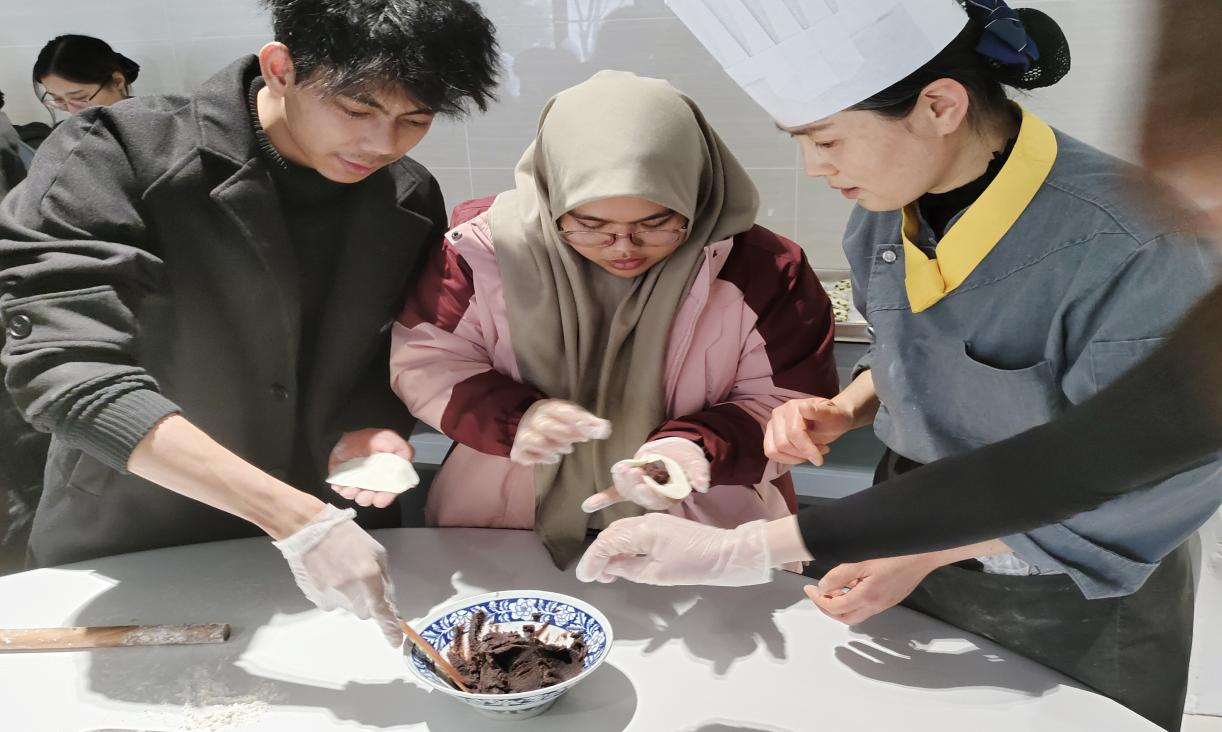 在活动现场,面点师傅们耐心地指导着我院留学生们制作中式面点,从和面、擀皮、包馅等各个环节都一一讲解。在师傅们的指导下,留学生们也亲自动手尝试制作中式面点。他们认真学习每一个步骤,用心感受面团的柔软和面皮的韧性。虽然初次尝试,但留学生们都展现出了极高的热情和耐心.