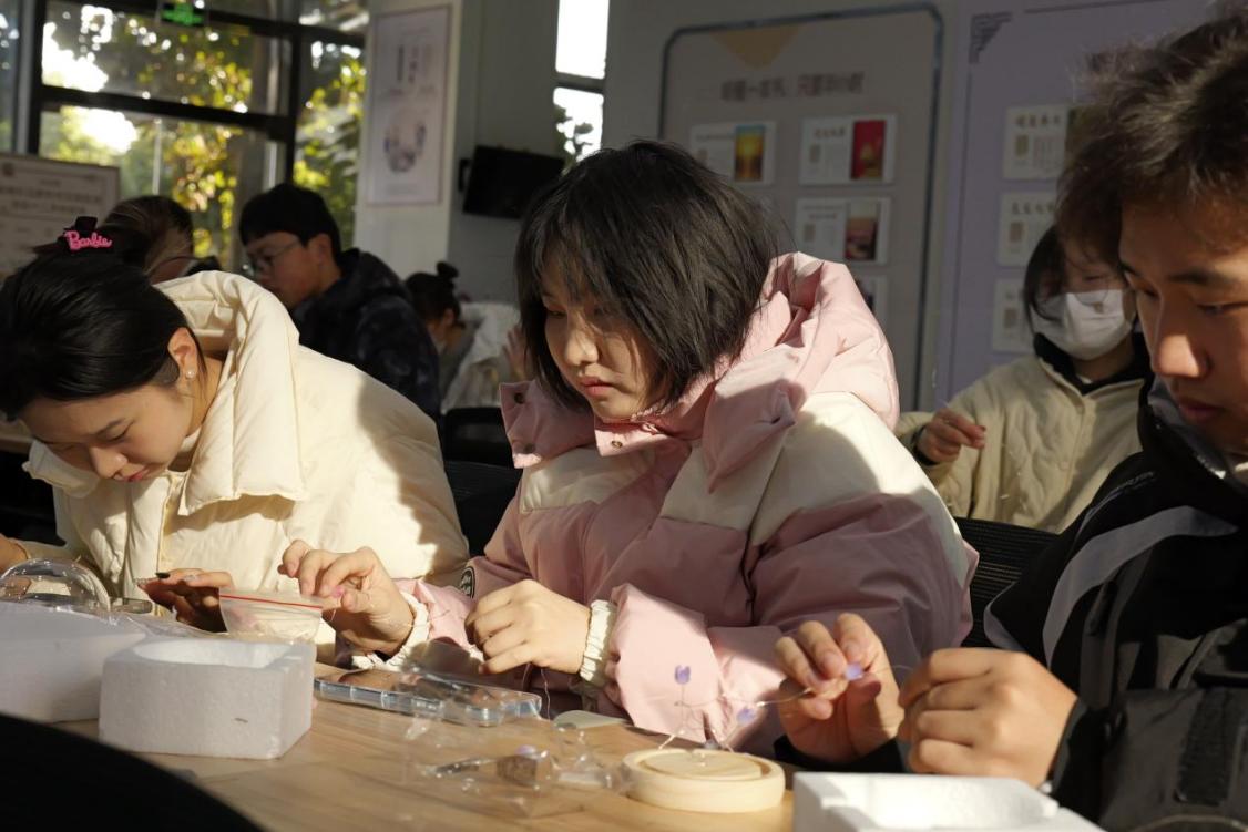 在良辅社区,同学们在社区工作人员的带领下,制作了郁金香氛围感小夜灯。医药学子以手造物,以物寄情。