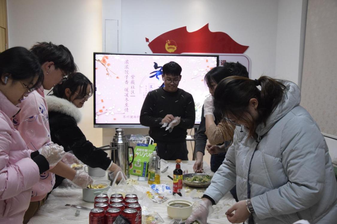 在一站式学生社区,同学们互相交流家乡馅料的制作方法和饺子的包法,共同调馅料、包饺子。同时,播放了关于冬至的传统文化和习俗的PPT,让同学们更加深入地了解了冬至的意义和内涵。
