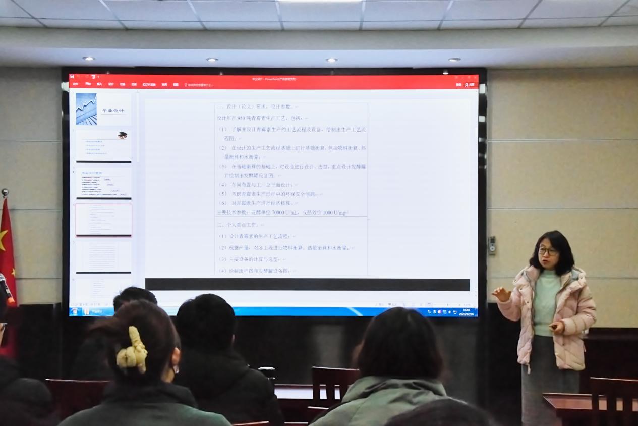 李老师围绕毕业设计题目、论文内容、设计图纸、课程设计与毕业设计四个方面进行讲解。以生物制药培训作为本次分享主题,然后进行案例分析,着重在流程设计、计算、设备选型、物料衡算方面进行探讨。李老师还摘取了部分学生毕业设计示例,坚持具体问题具体分析,根据学生们的毕业设计进行点对点讲解讨论。随后,李老师介绍了毕业设计论文、主要设备的手绘图和工艺流程图等图形制作问题。最后,李老师指出课程设计题目可以不断创新,缩小范围,关注于一小部分。会议尾声,各位老师对李老师提出的课程创新这一理念进行了探讨,以求能寻找出最适合学生研究和精进的论题。
