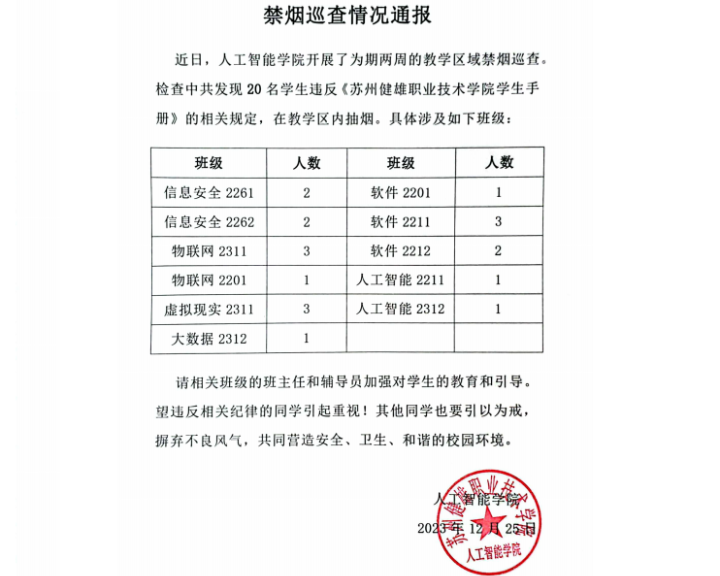 禁烟行动是维护校园环境的重要一环,也是提升学生健康意识的重要手段。人工智能学院将进一步加强学生的教育和引导,积极营造清新、健康、无烟的校园环境。(图文/姜来 审核/陈东生)