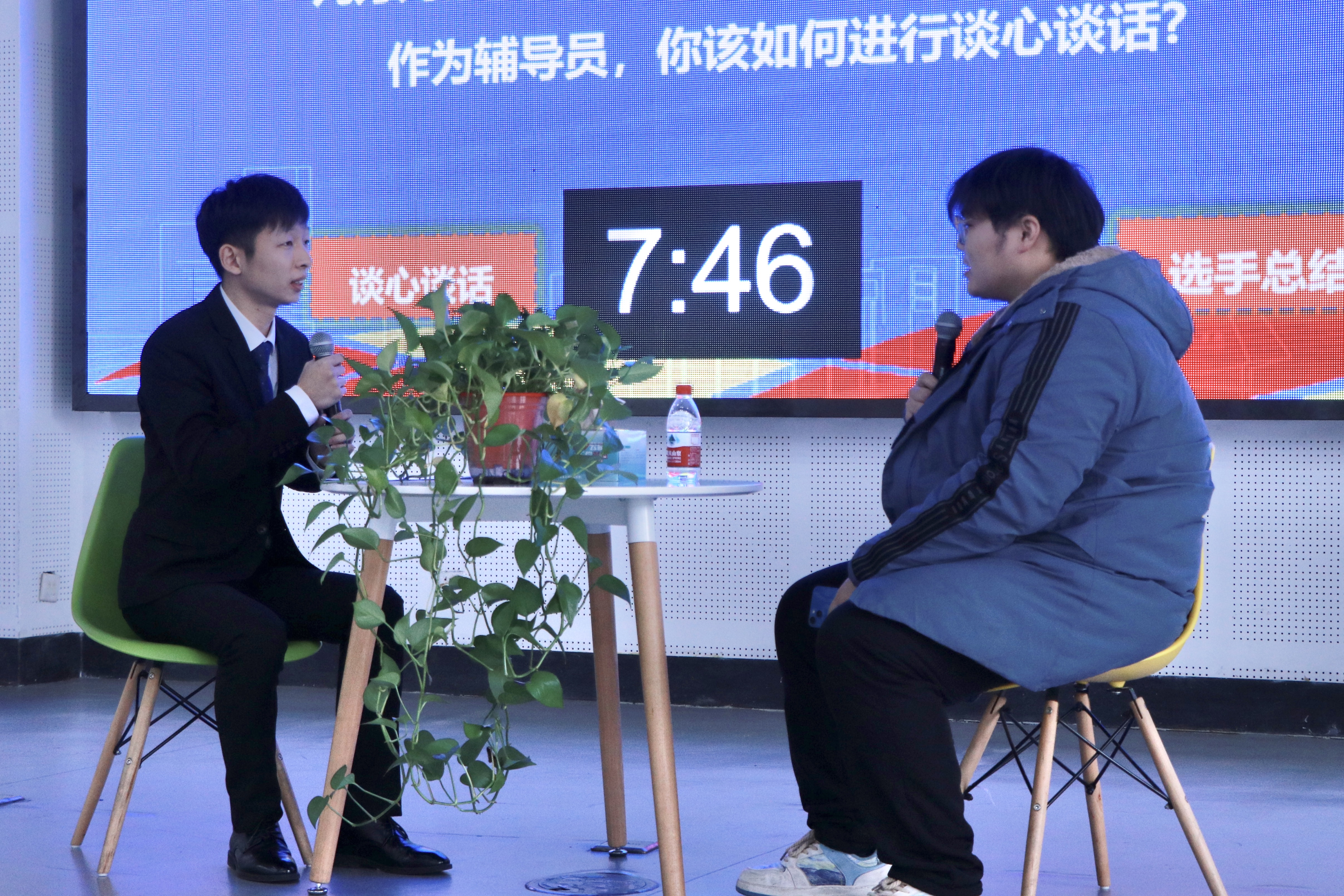 谈心谈话环节更是考验了辅导员们的沟通技巧和情感智慧。在这一环节中,参赛选手们与助演学生再现日常谈心谈话的场景,展现了他们为学生答疑解惑、开展思想政治教育和价值引领的能力。在此环节中选手们表现出了优秀的职业能力和高超的专业技巧。