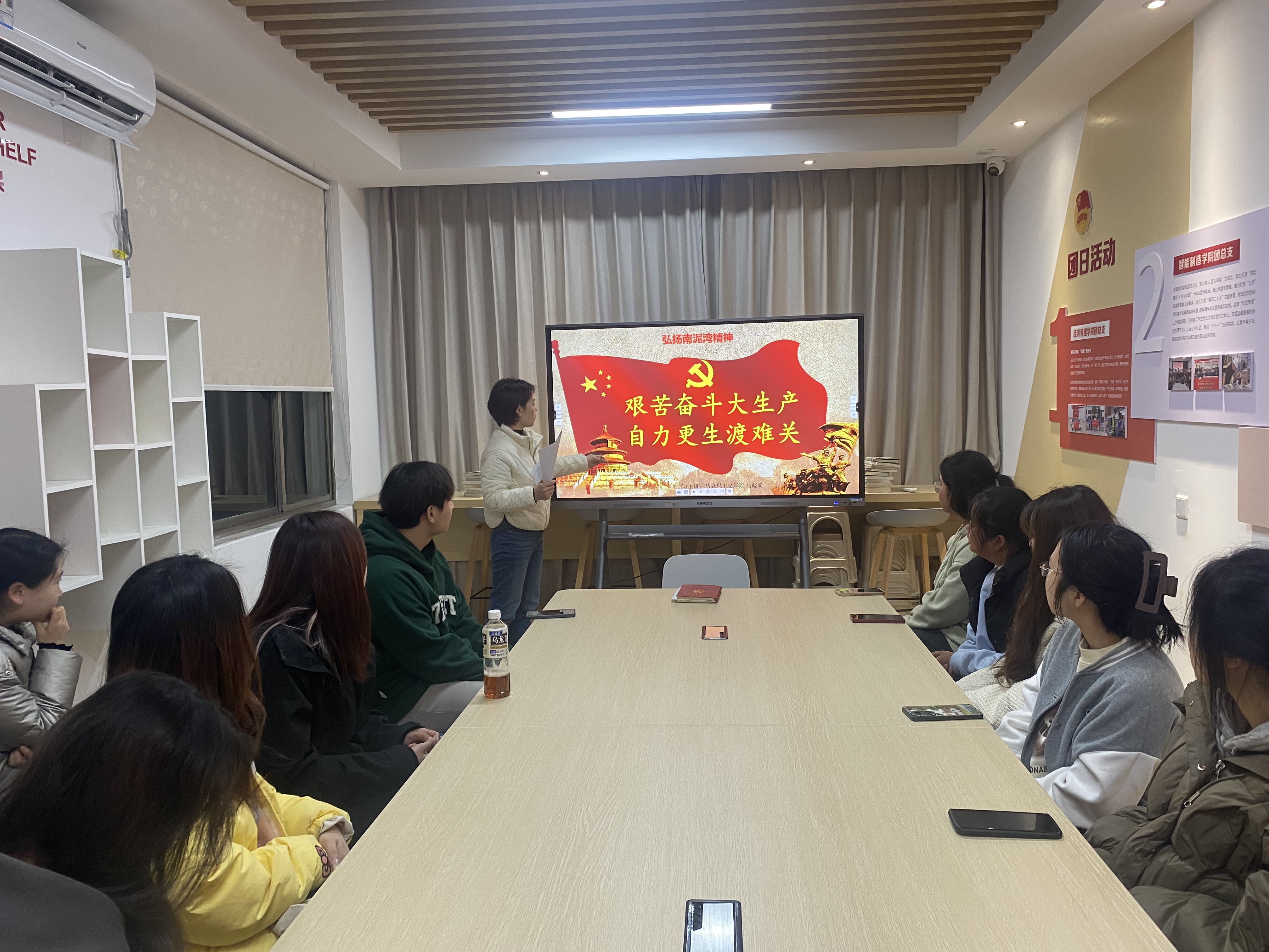 马老师以《南泥湾》这首歌为切入点,引领在场学生们穿越时空隧道,重返那段共产党人于大生产时期顽强拼搏、自给自足的历史现场。活动中,马老师还播放了大生产时期的珍贵视频资料,通过一个个感人至深的小故事,深入讲解了南泥湾精神的历史背景,帮助在场同学深刻领会了南泥湾精神的本质内涵,使同学们深切感悟到“艰苦奋斗、自力更生”这一精神实质。
