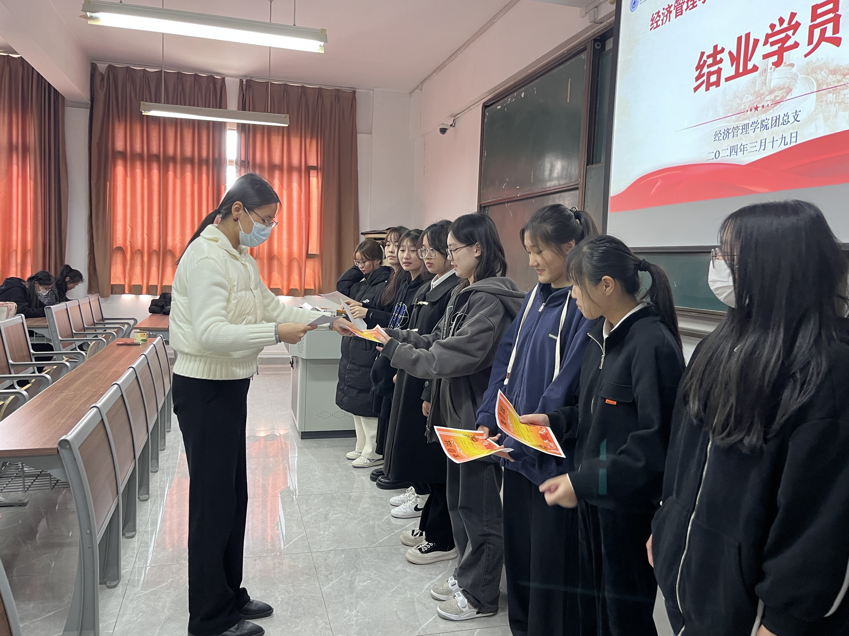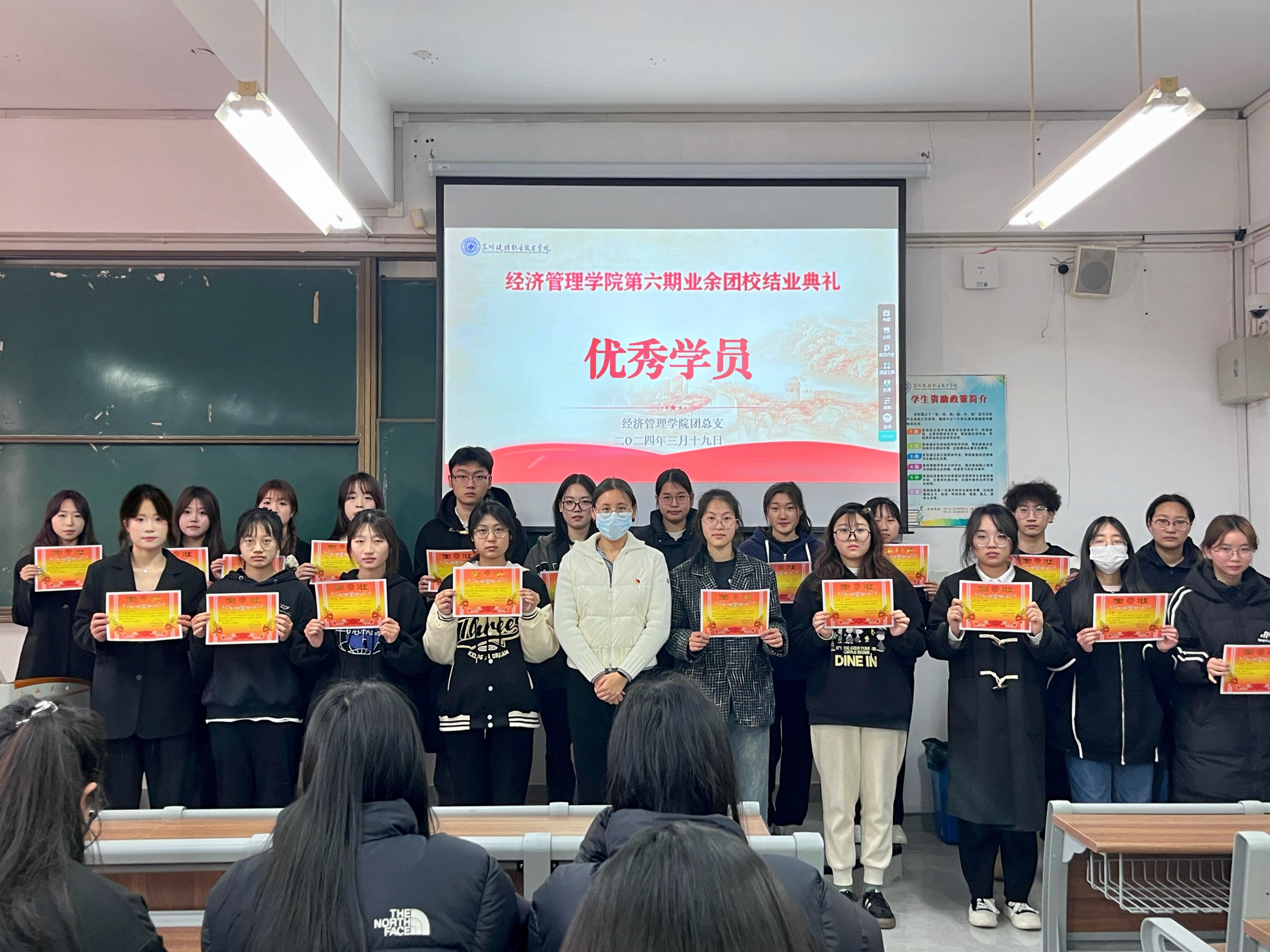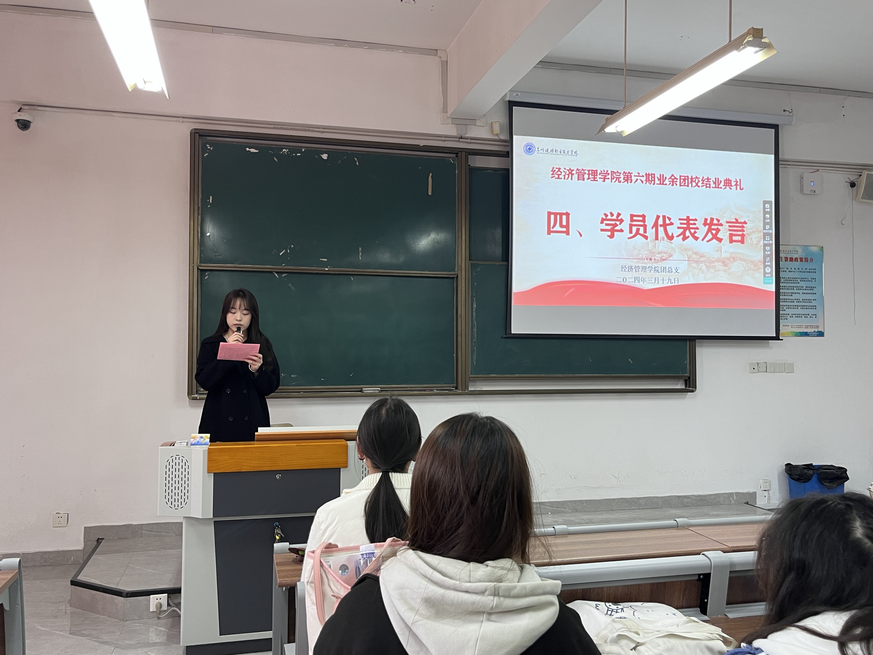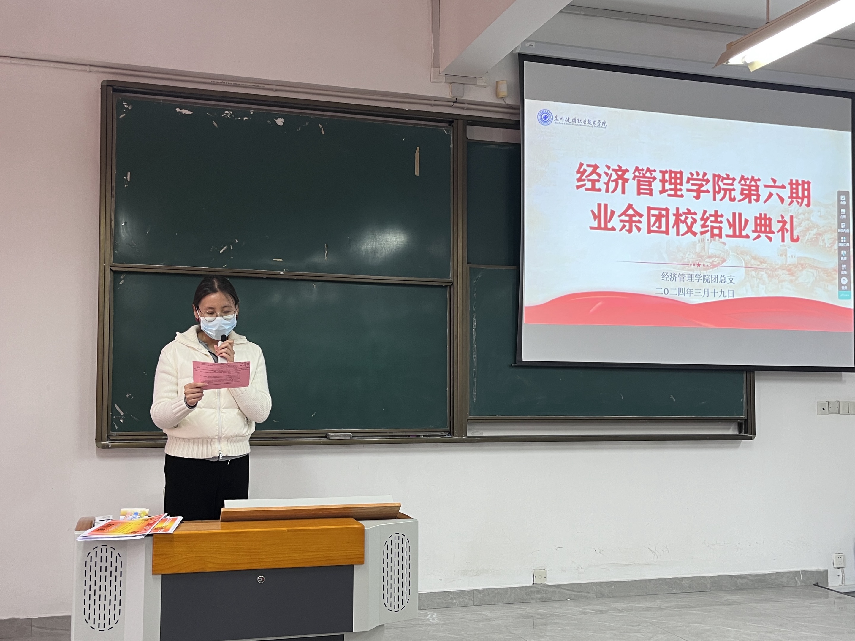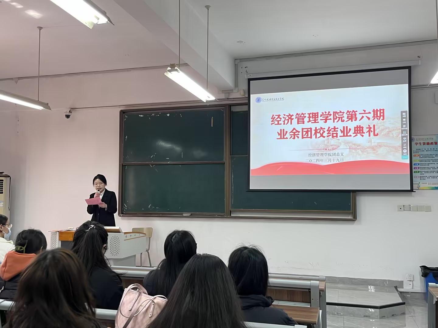 为凝聚青春力量,夯实共青团基层基础,进一步加强大学生思想政治教育,朝着目标前进,肩负新使命,继航新征程。3月19日中午,经济管理学院在C3-301教室举行第六期业余团校结业典礼。辅导员顾宇婷老师及全体业余团校成员出席本次活动。活动由学生团总支(学生)副书记龚欣妍主持。