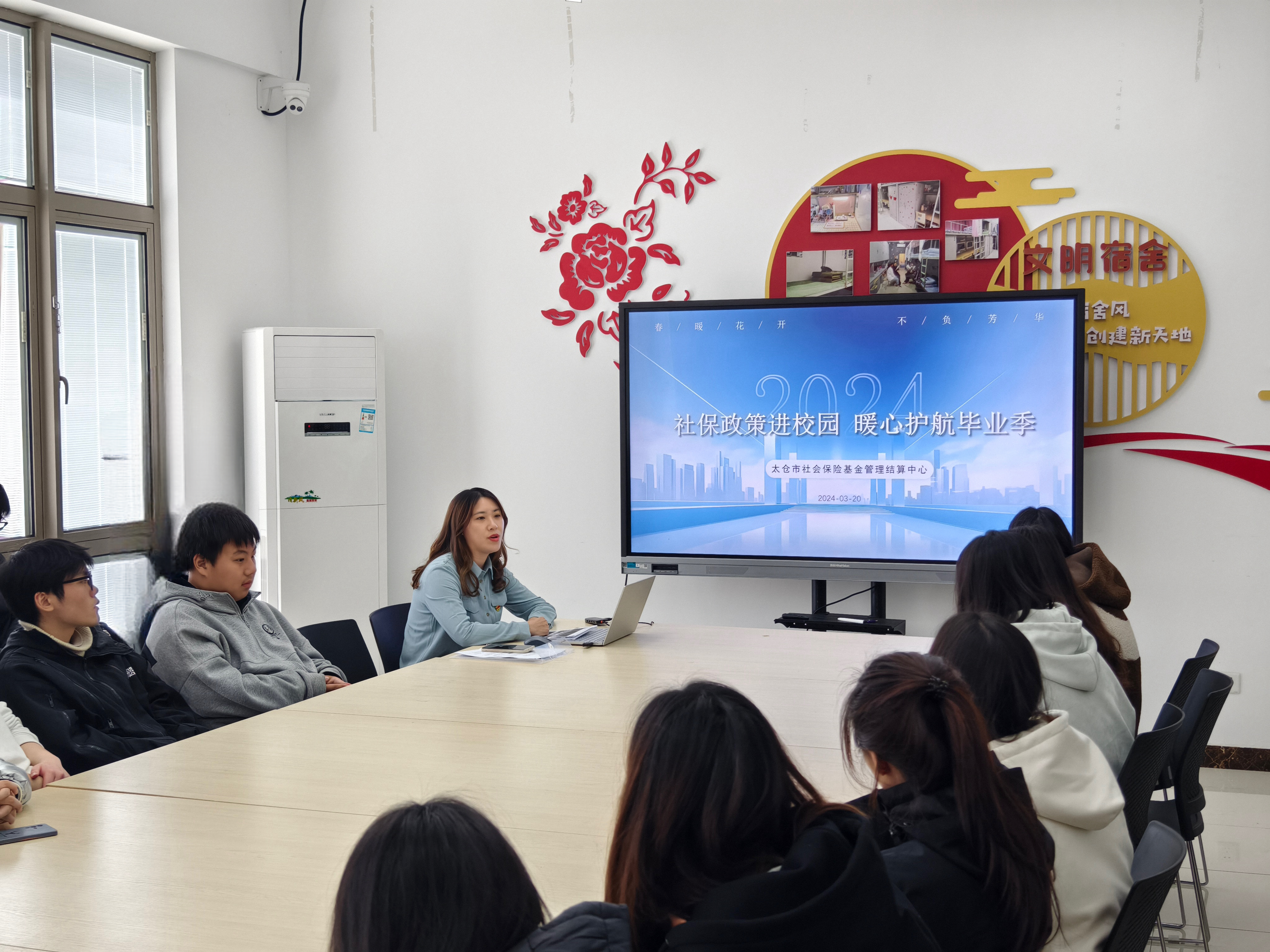 为广泛普及社保政策,激发毕业生参加社会保险的积极性和主动性,帮助毕业生更好了解关于社会保险相关政策内容,经济管理学院于3月20日在紫薇社区开展“社保政策进校园 暖心护航毕业季”活动。本次讲座邀请太仓市人社局社保中心王珅辰科长主讲,辅导员顾子琪老师和经济管理学院21、22级部分学生代表参加。