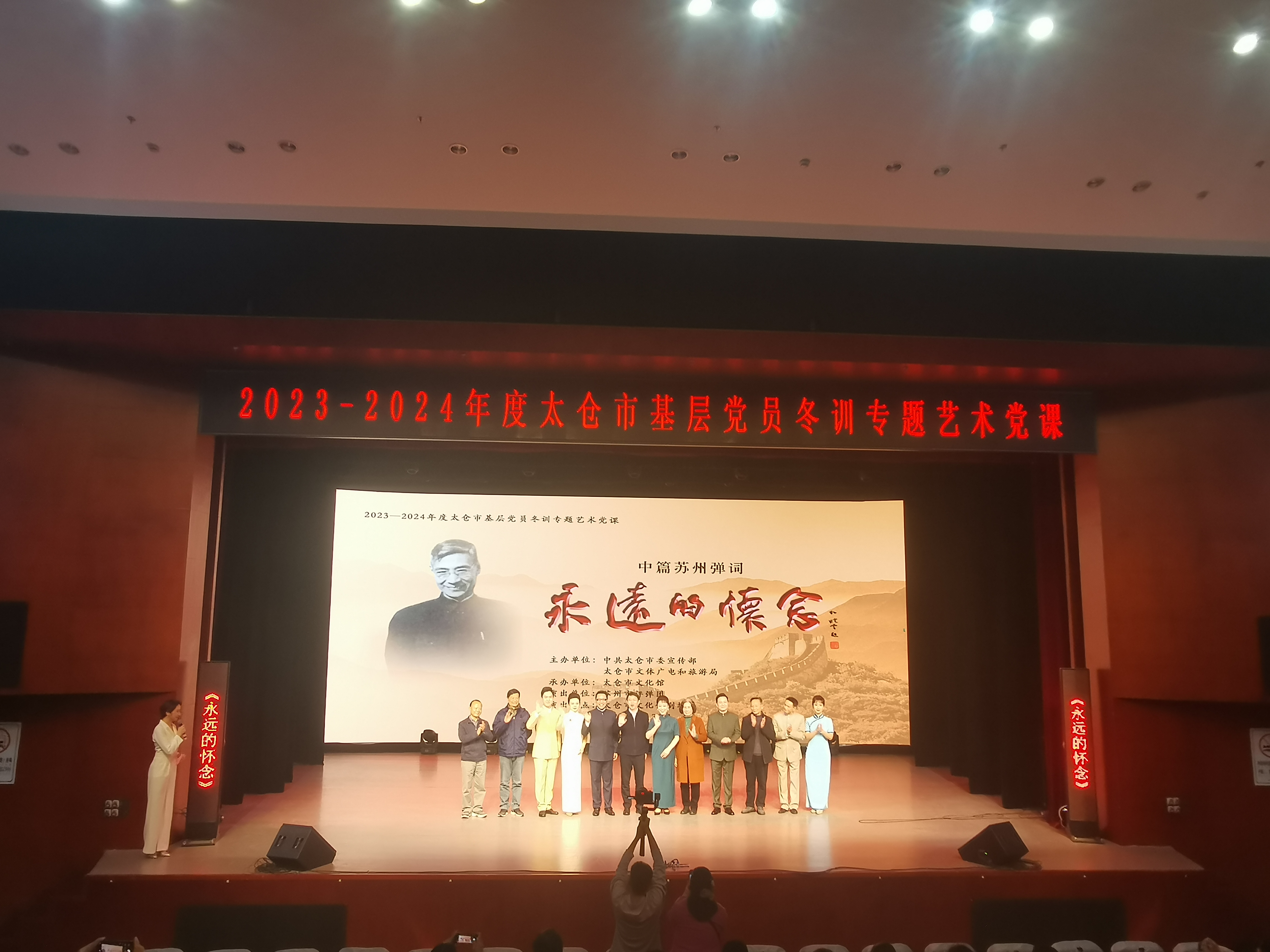 2024年3月26日下午2023-2024年度太仓市基层党员冬训专题艺术党课在市文化馆举行,经济管理学院党员代表步滕滕参与了本次党课学习。本次艺术党课内容为中篇苏州弹词《永远的怀念》,通过艺术结合党史理论和新时代奋斗故事的方式,讲述“两弹一星”元勋郭永怀的光辉事迹。