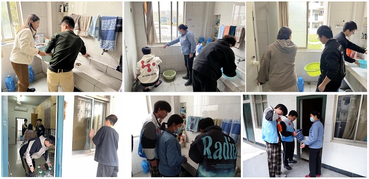 本次整改活动宿舍分布在M1、M2、M4、M10、M11栋。活动中,辅导员、8名宿舍管理员和26名志愿者以“1+1+2”模式组队,负责指定楼栋和楼层,辅导员充分调动同学积极性,师生共同打扫宿舍卫生排查安全隐患;宿舍管理员指导学生卫生间除污、洗漱用品和桌面物品摆放,志愿者发放清洁用品、喷撒洁厕灵等。除此外,还设置机动组,由吴成炎、金杰带领志愿者对所有宿舍开展巡检、排查、补给工作,吴成炎再次向同学们强调用电安全,规范用电、确保人走断电,号召同学们为自己和他人安全负责宿舍卫生整改活动历时4小时,涉及136间宿舍,逐一安全隐患排查、卫生整改、签字验收。