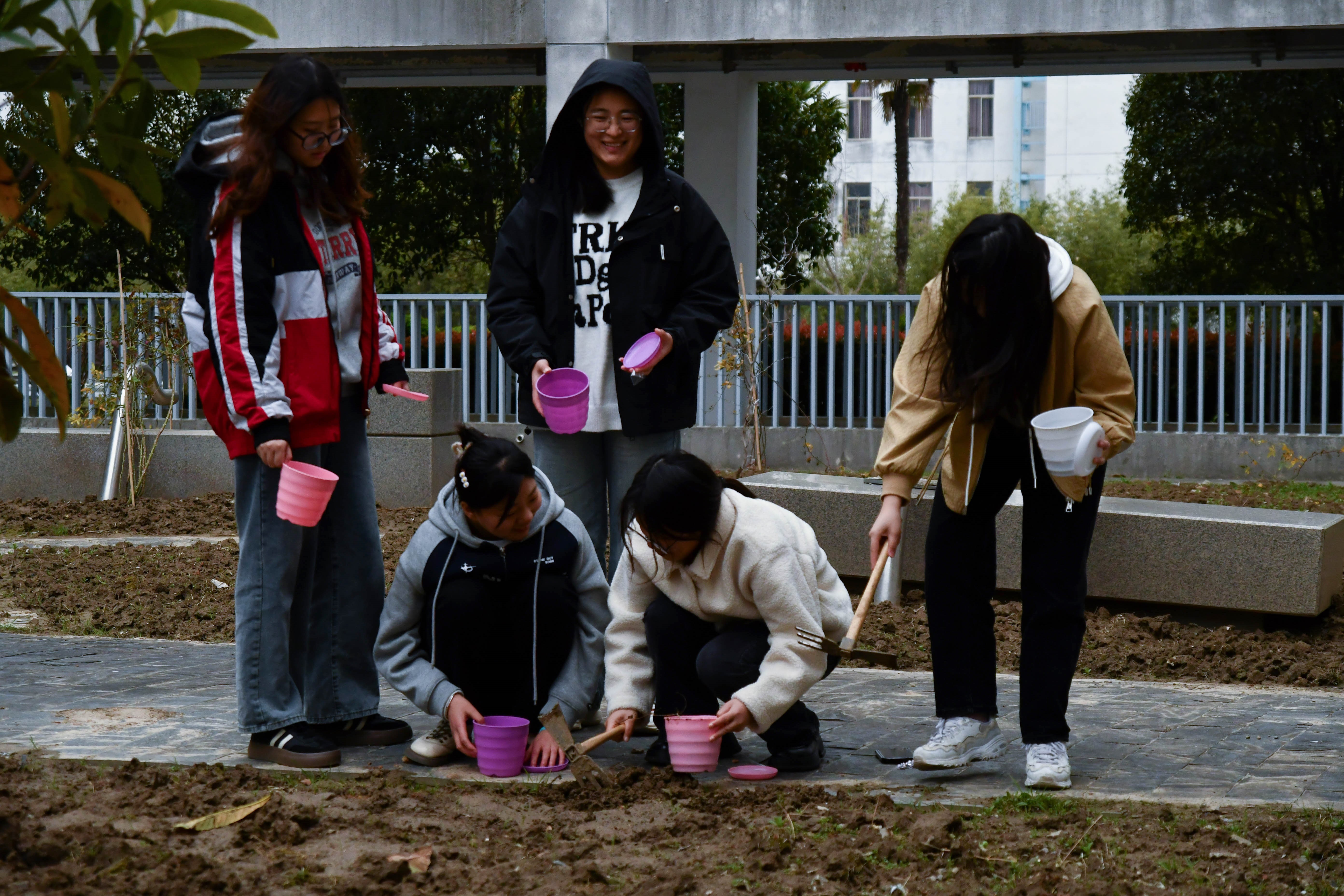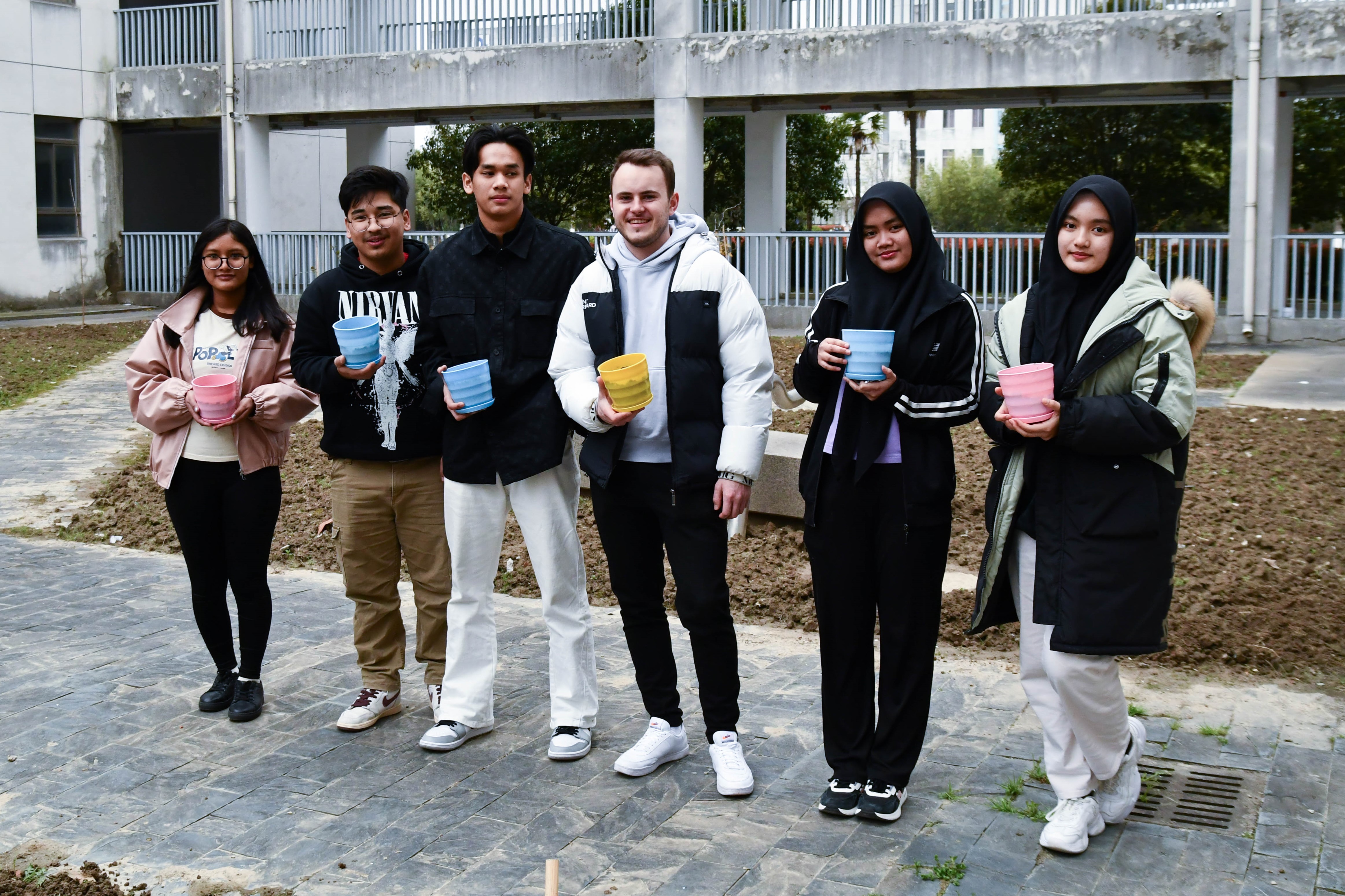 活动中,大家挥锹铲土,将土放进自己的盆栽当中,再把种子小心翼翼地埋入土壤,最后用土盖上,浇上适量的水,种植盆栽就完成了。大家相互合作,现场氛围轻松活跃。部分留学生也积极参与进来,在老师及志愿者的带领下也种植成功了。