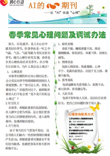人工智能学院《AI的心期刊》第二期针对春季常见心理问题进行了科学的介绍,讲解了为什么春季是心理问题的多发季节,以及相应的调试办法,帮助同学们学会用健康科学的方法调适心理,用美好的心情拥抱美丽的春天。