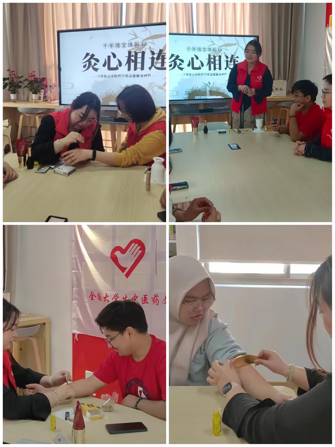 为了弘扬中医药文化,加深留学生对中国传统医药文化的了解和认识,418日下午,生物医药学院在M3一站式学生社区开展了“艾灸暖人心”留学生中医药文化体验活动,带领留学生现场体验针灸、艾灸、刮痧等中医传统项目,让外国留学生在活动中感受中医魅力。活动由辅导员贺小艳、“百草传音”团队志愿者及部分留学生代表共同参与。