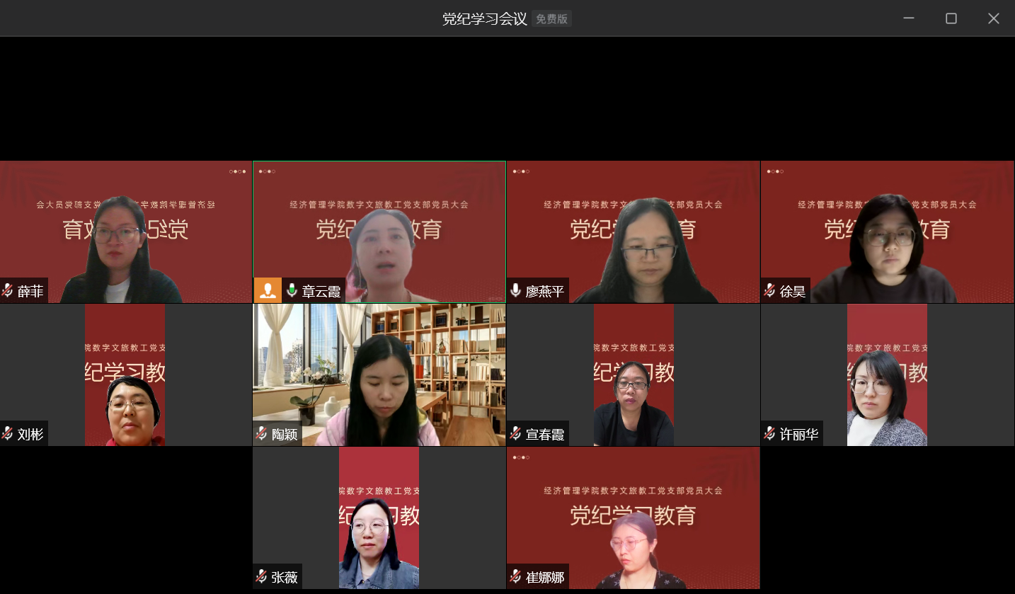 4月27日晚,经济管理学院数字文旅教工党支部书记章云霞组织全体党员老师开展《中国共产党纪律处分条例》线上学习。