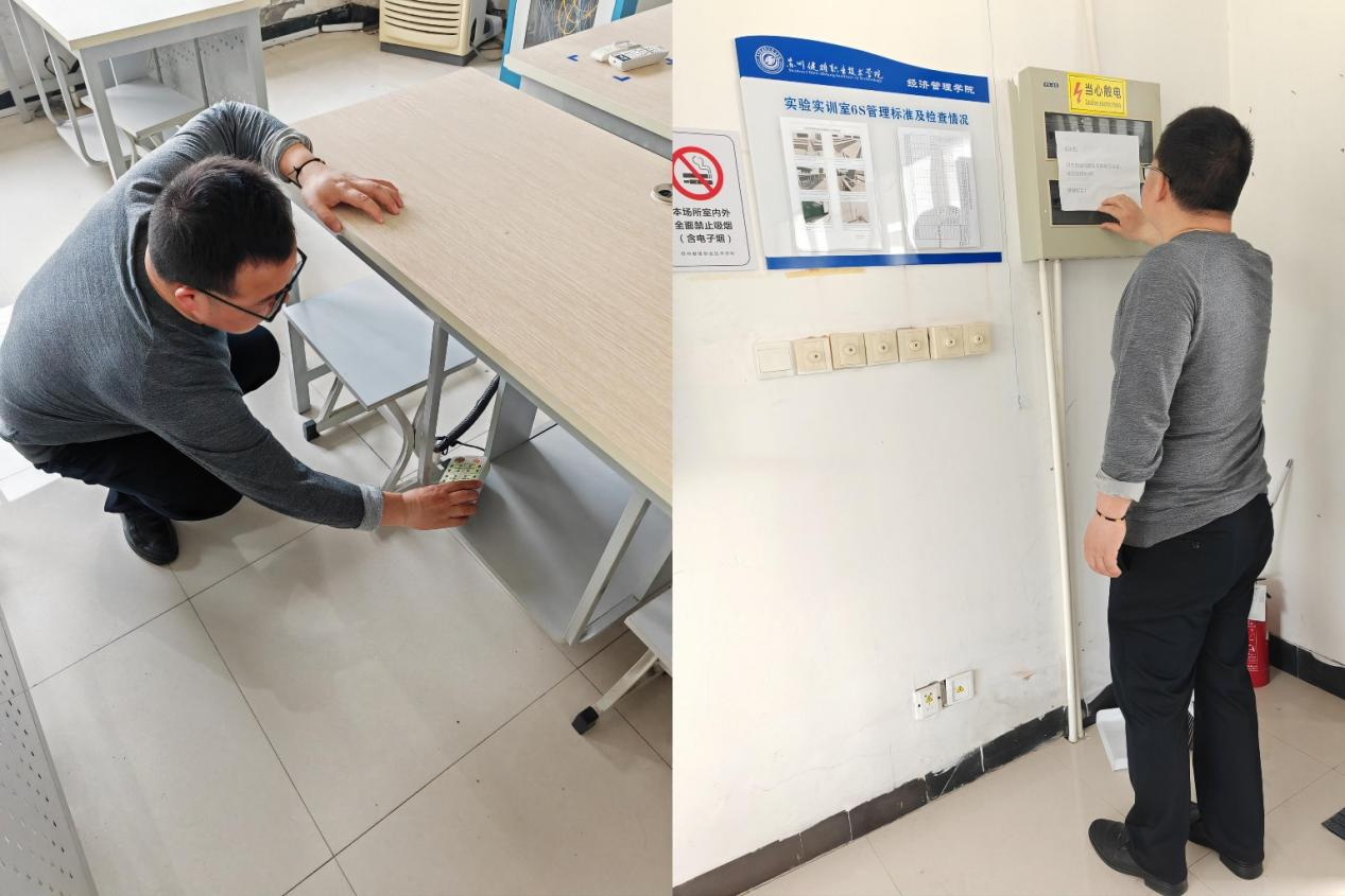 在实验实训场室,经济管理学院院长樊奇详细检查了设备设施的安全使用、用电安全、警示标志、安全规章制度,特别强调场室管理员要持续做好5S管理工作。