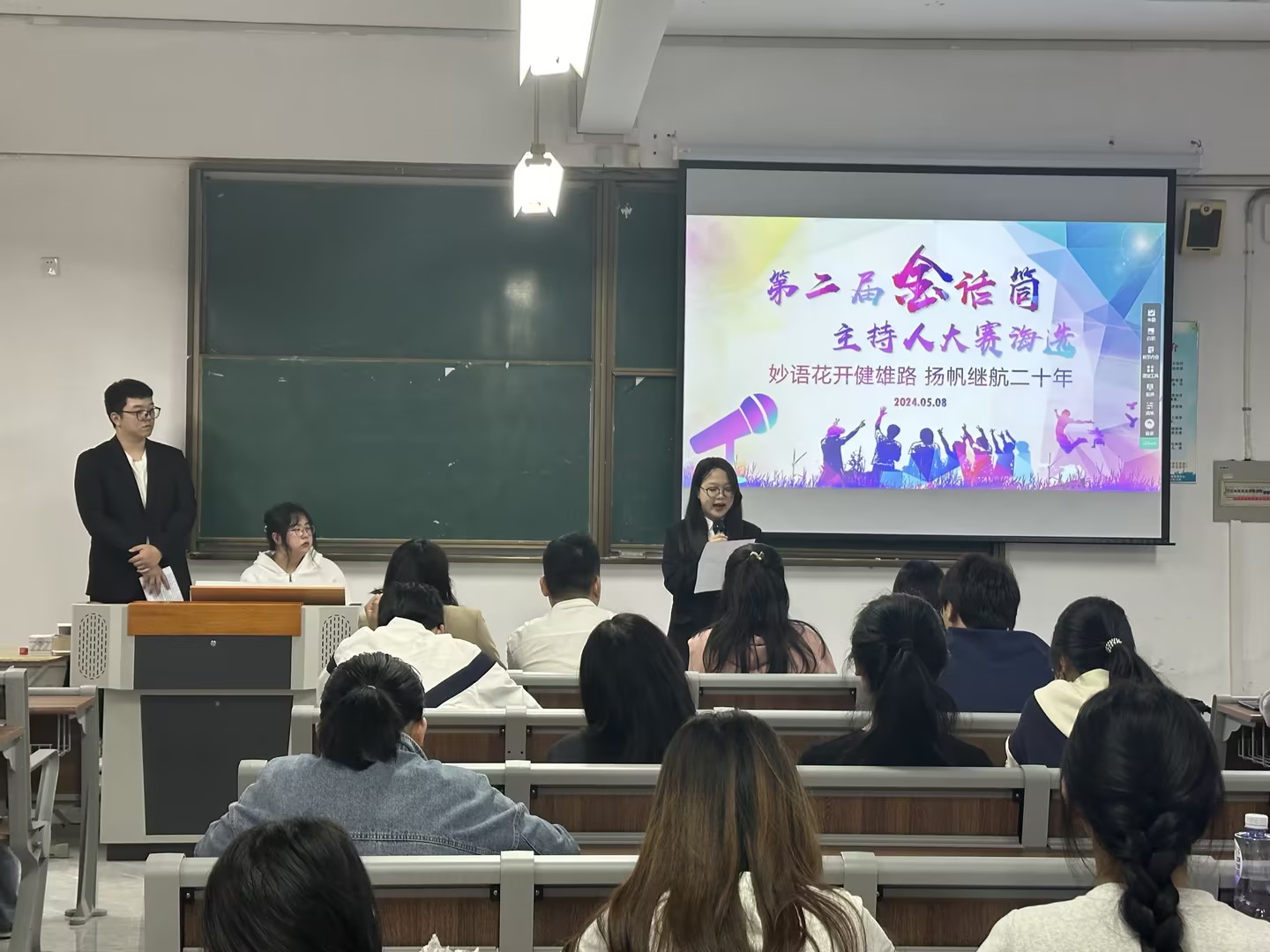 海选由吴铮男同学主持,二十位选手依次上台,通过朗诵、脱口秀、模拟讲解等形式展现自己的主持风采。经过激烈的角逐,最终袁慧婷、万如意、张雪琳等五位选手成功进入下一阶段的赛程。