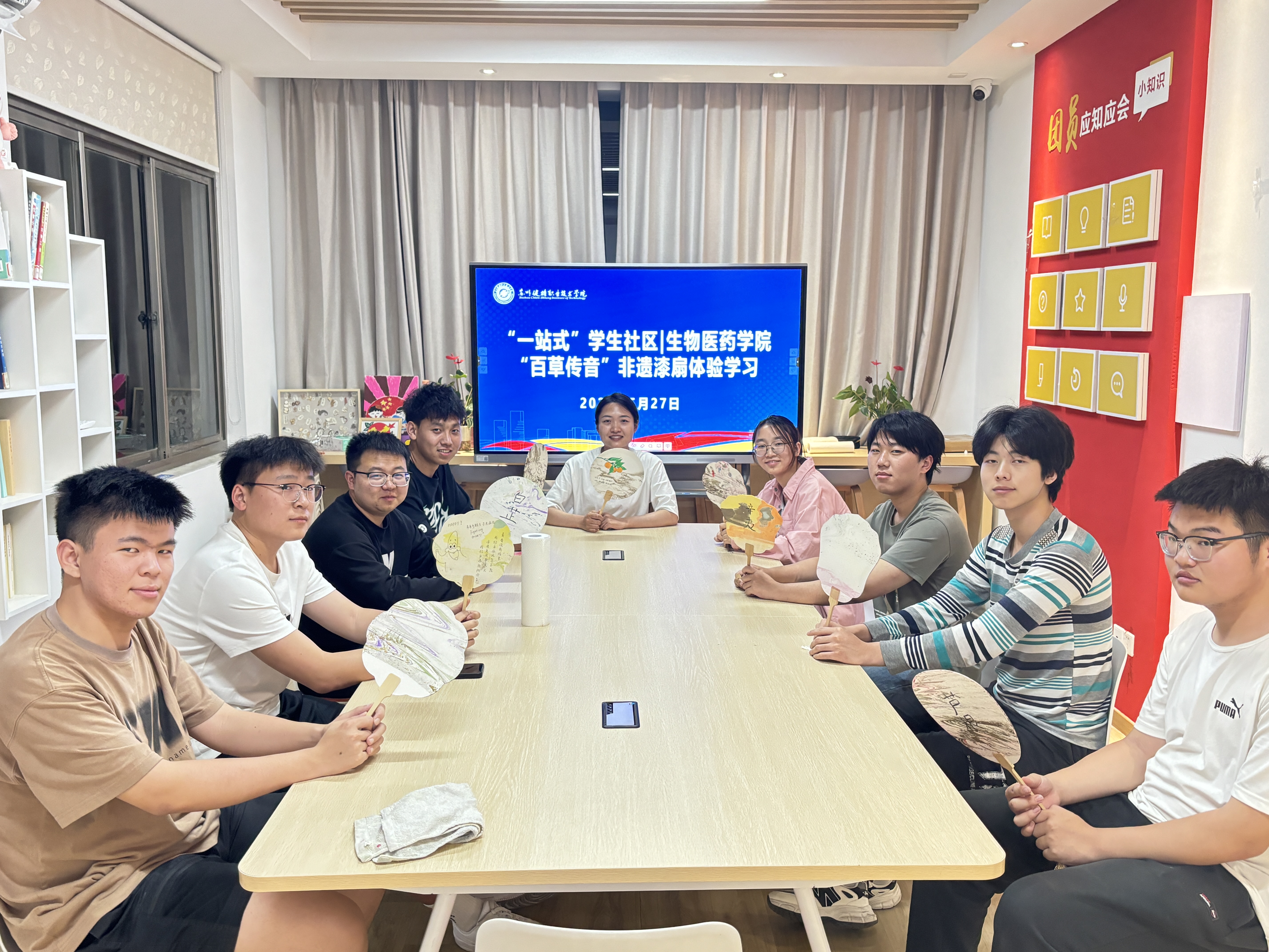 为弘扬中医药文化,增强学生的实践能力和对中医药的认识,生物医药学院在“一站式”学生社区特别举办了“百草传音”中医药+非遗漆扇体验活动。活动由辅导员贺小艳主持,生物医药学院学生共同参与。