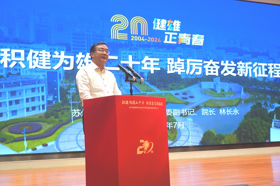 林长永在报告中指出,2004年,学院经江苏省人民政府批准正式成立,先后通过两轮教育部人才培养水平评估,入选江苏省示范性高职院校和江苏省中国特色高水平高职学校建设单位,获评江苏省职业教育先进单位,荣获国家级教学成果奖,自实行苏州市属高校高质量发展综合考核以来,始终保持第一等次,实现了从“规范办学”到“特色办学”再到“高水平办学”的跃升。二十年来,学院办学空间不断拓展,办学规模不断扩大,见证了科教新城拔地而起,与太仓高新区携手共建中德双元制职业教育产业园,事业发展的每一步都与太仓城市建设同呼吸、共命运,走出了一条“校地相生相伴,产教深度融合,双元特色发展”的办学之路。