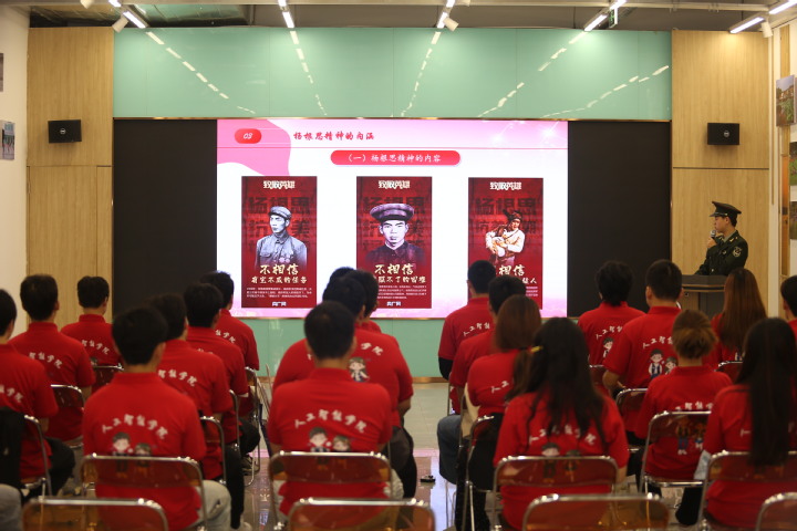 此次专题教育在激昂的全体国歌奏唱环节中拉开序幕。随后,优秀学生干部、退役军人马英奇给大家带来了团课《战火淬炼的特级英雄:杨根思》,通过对新中国第一位特等功臣和特级战斗英雄杨根思英雄事迹的讲述,让团员青年们了解到了这位了不起的英烈从1944年入伍,先后经历了抗日战争、解放战争和抗美援朝战争的炮火洗礼。战斗中,他不畏艰难困苦,履立战功,先后获得“爆破大王”、“一级战斗英雄”等称号。1950年11月,在抗美援朝战争第二次战役分割围歼咸镜南道美军战斗中,时任志愿军某部连长的杨根思,面对美军的强势进攻,只身抱起仅有的一包炸药,冲向敌群与爬上阵地的美军同归于尽,英勇捐躯,用28岁的生命践行了他在1947年入党时的宣誓:“我这一辈子都交给党了”。杨根思的英雄事迹感动了在场的每一位同学,让大家深刻认识到了英烈们身上体现的民族精神和时代精神以及今日美好生活的来之不易,也更加坚定了心中的爱国主义信念。