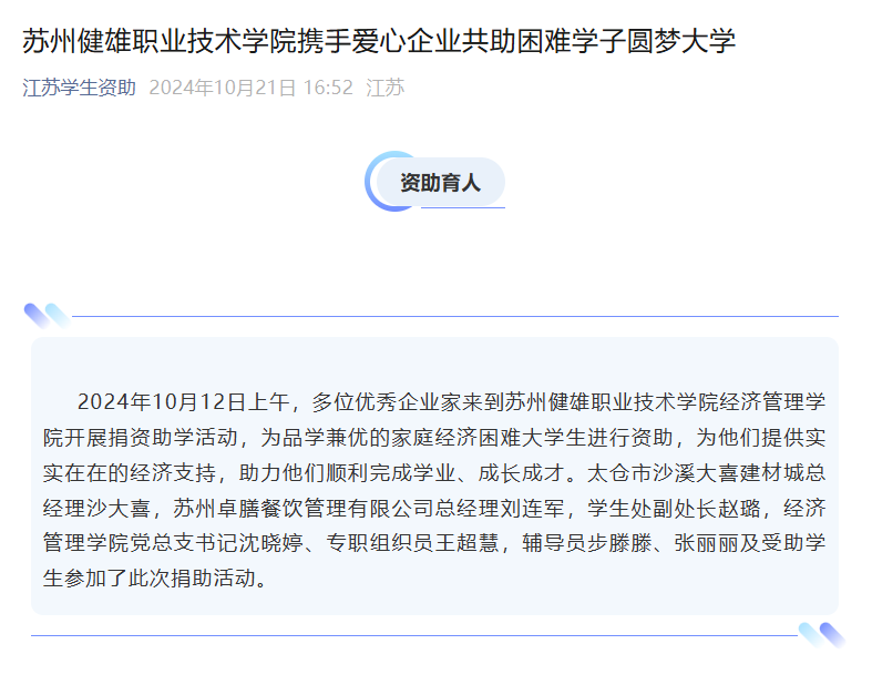 江苏学生资助 | 苏州健雄职业技术学院携手爱心企业共助困难学子圆梦大学