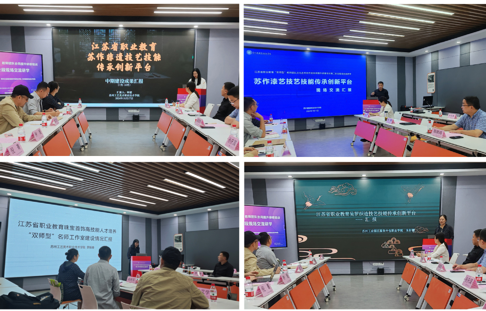周琪玮首先介绍了学院“双元制”特色发展情况、教师团队建设情况和艺术设计学院基本情况。徐艾学处长代表召集院校介绍了本次研学活动的内容、目的和具体要求。汇报交流环节,五个省“双师型”教学团队对照项目申报的预期成果,逐项梳理汇报自身完成情况,查摆不足。对阶段建设取得的主要成效和经验进行了交流分享。现场考察环节,重点就江苏省职业教育“苏作漆艺”技艺技能传承创新平台的工作室建设情况、组织运行情况及工作现场进行了调研。