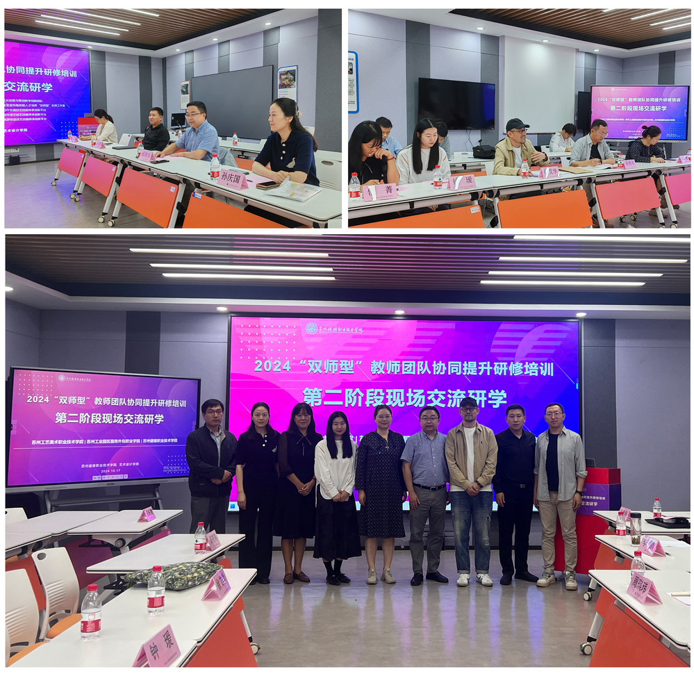 10月17日,2024年江苏省“双师型”教师团队协同提升研修培训第二阶段现场交流研学在我院举行。来自苏州工艺美术职业技术学院、我院以及苏州工业园区服务外包职业学院的五个文化艺术大类“双师型”教学团队齐聚一堂,共同探讨和交流“双师型”团队建设经验和做法。本次研学由苏州工艺美术职业技术学院召集,我院人事处处长周琪玮、苏州工艺美术职业技术学院人事处处长徐艾学出席会议。