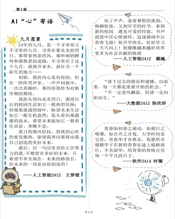 本期《AI的心期刊》聚焦秋季常见的情绪问题、心理问题以及“悲秋综合征”现象,通过科学分析与专业建议,为同学们的心理健康保驾护航。此外,本期《AI的心期刊》还新增了两个亮点专栏——《AI“心”寄语》与《AI“心”动态》。其中,《AI“心”寄语》是一个特别策划的互动环节,旨在倾听同学们的心声与想法。通过征集同学们的寄语,期刊不仅为每一位参与者提供了一个表达自我的平台,更鼓励大家勇敢说出内心的真实感受,积极与未来对话。这一栏目不仅加深了同学们之间的情感交流,也让大家从倾诉中获得了情感的释放与心灵的慰藉。