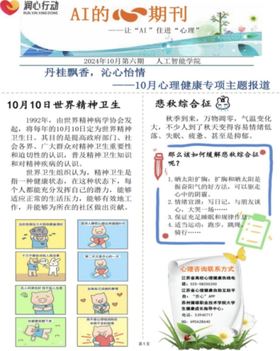 金秋时节,金风轻拂,丹桂飘香,整个校园被一片橙黄与翠绿交织的画卷温柔包裹。在这美丽的季节里,人工智能学院精心策划的《AI的心期刊》第六期如约而至,为同学们带来了一份特别的心理健康指南。