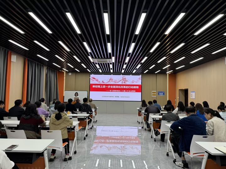 学习会上,苏州干部学院专家徐继梅应邀作“新征程上进一步全面深化改革的行动纲领——二十届三中全会精神解读”主题辅导报告。徐教授围绕“进一步全面深化改革新任务:怎么改”“进一步全面深化改革背景:为何改”“进一步全面深化改革新部署:改什么”三个方面,对党的二十届三中全会精神进行了深入阐释、全面导读和系统讲解,并以习近平总书记对江苏发展的期盼做了概括总结。徐教授的讲座“讲的透”、“听得懂”、“用得上”,引领广大教师在学思践悟中奋发图强、挺膺担当。