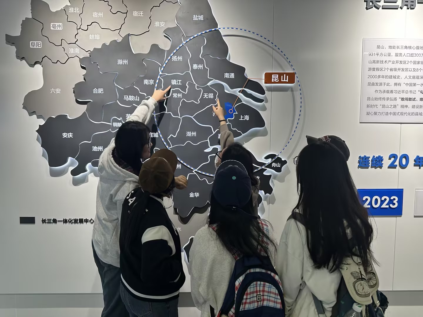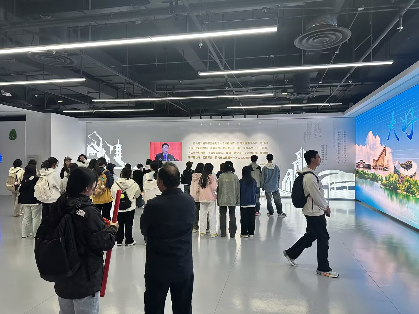 线路四“绿色发展,诚信为人”,受资助学生来到昆山科普馆,观发展成果之路,叹科技进步辉煌成就。展区通过大量的图片、视频和实物,生动展现了昆山如何从一个农业县发展成为全国百强县之首的过程,大家在走访中了解到以昆山为代表的江苏地区“绿色发展探新路,诚信为本启征程”的发展历程,实地感悟“诚信力量”。