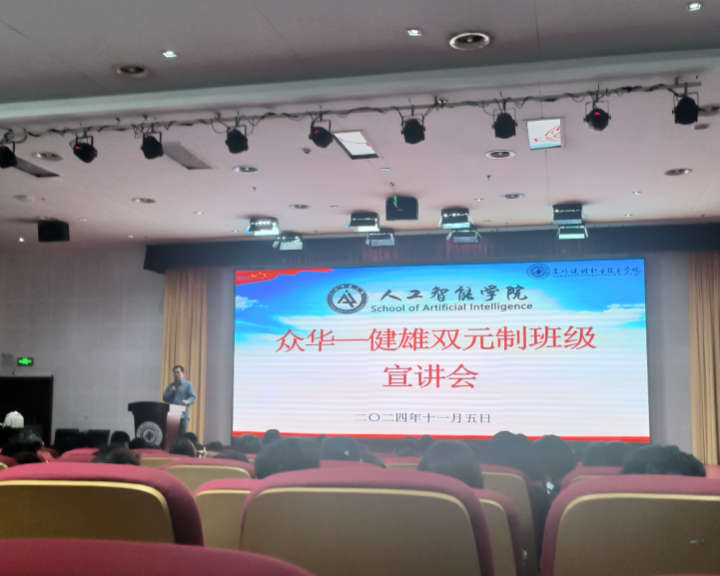11月5日,为了深化产教融合,推进“双元制”班级建设,众华电子科技有限公司与人工智能学院联合举办了众华-健雄“双元制”班级宣讲会。此次宣讲会由物联网应用技术专业负责人胡宏梅主持,出席会议的有众华电子科技有限公司解克举总经理、人事主管吴中华经理、健雄学院双元制学岳向阳老师、智能产品及物联网应用技术专业全体教师、24级辅导员以及物联网、人工智能和智能产品专业的24级全体新生。