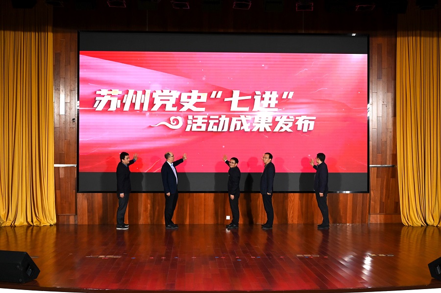 徐海明、蒋敬东、杨丕金、顾卫、芮萌,共同发布苏州党史“七进”活动成果。