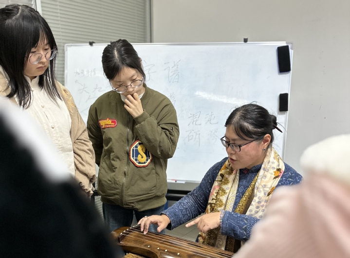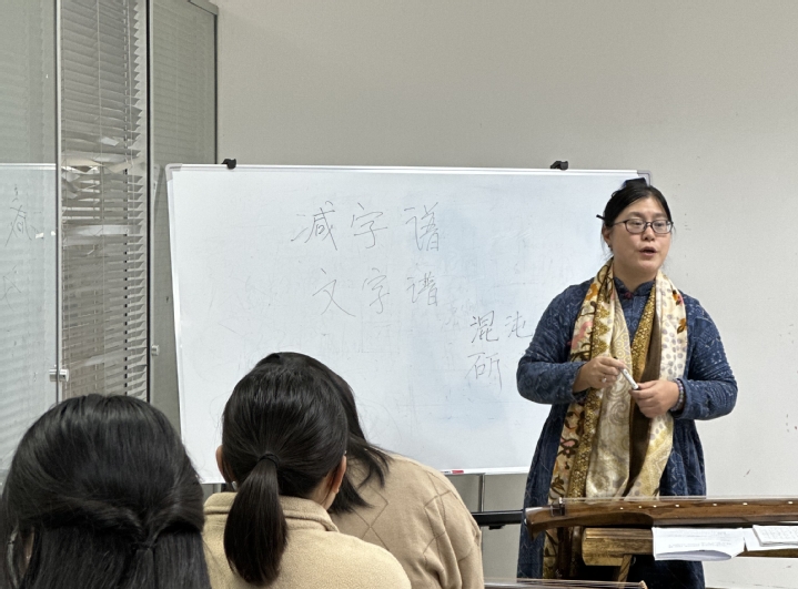古琴课程邀请到了民进会员、古琴高级教师、中国传统文化促进会古琴文化艺术委员会会员、江苏省美协会员、太仓市政协委员、邢莉萍老师担任主讲老师,在课堂上,邢莉萍老师首先向同学们系统地介绍古琴的历史、文化内涵、基本构造等知识,让同学们了解古琴在中国传统文化中的地位和作用。