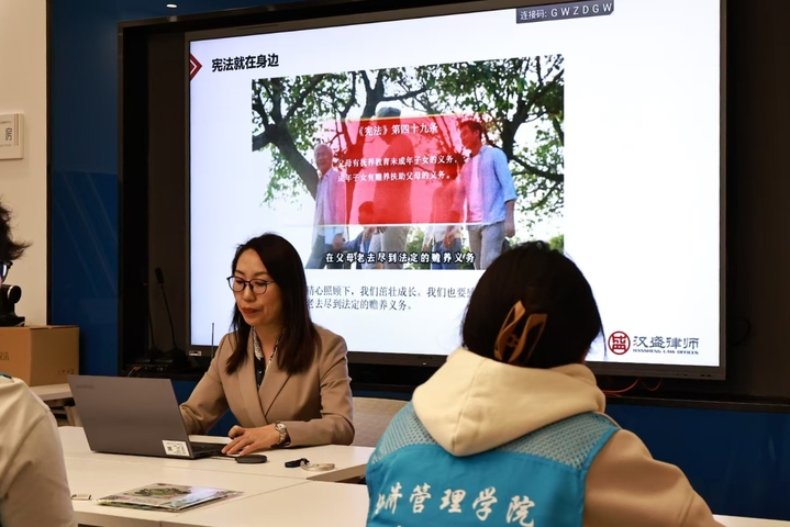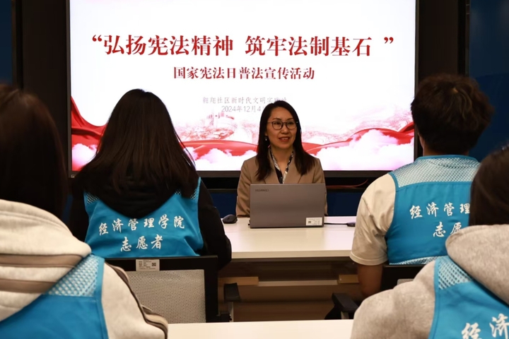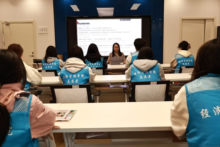国无法不治,民无法不立。2024年12月4日是全国第十一个国家宪法日。在宪法日到来前夕,为了增强学生法治观念,大力弘扬宪法精神,引导学生深入了解宪法、尊崇宪法精神,经济管理学院联合陆渡街道翱翔社区开展“弘扬宪法精神,筑牢法制基石”国家宪法日普法宣传活动,特邀司法所陆燕律师作为主讲人。经济管理学院30名学生代表参与此次活动。