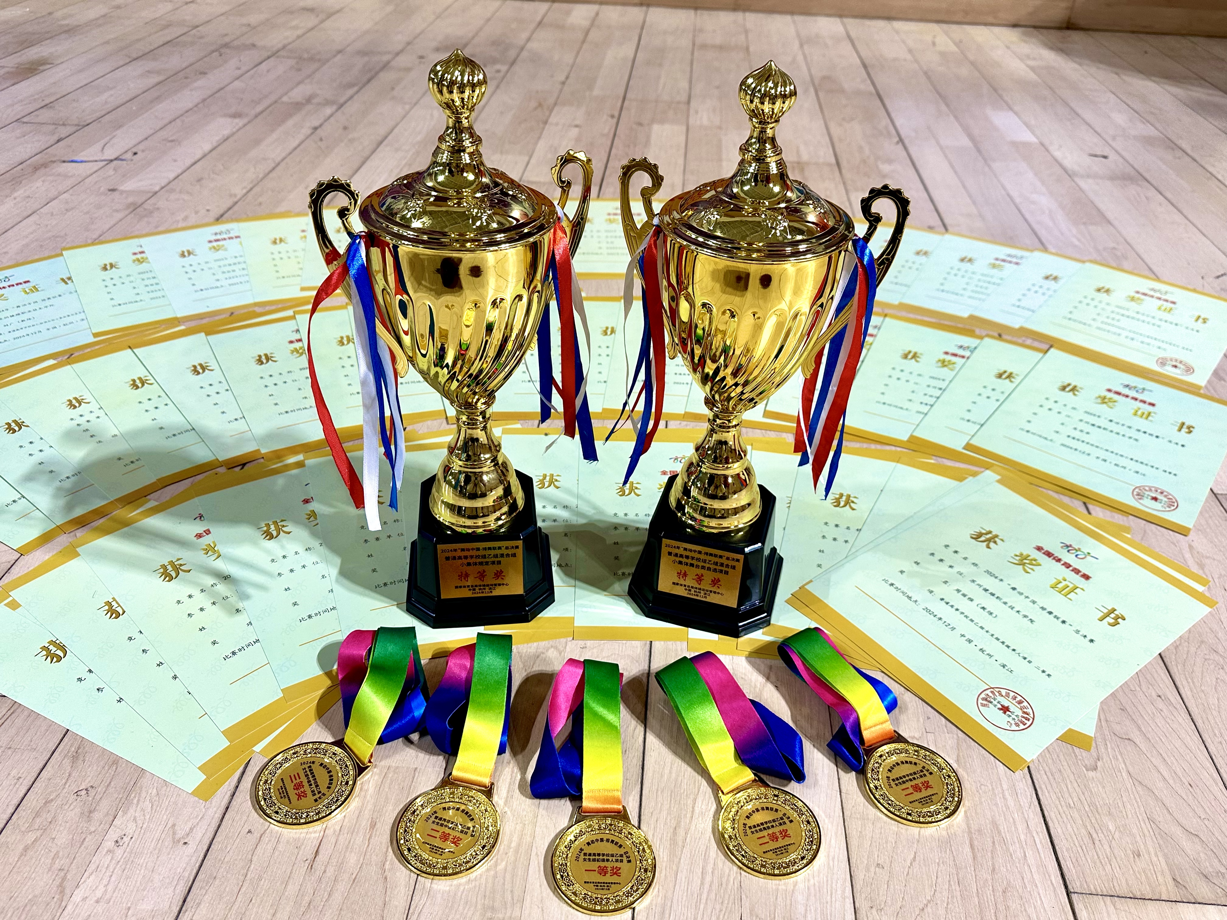 在赛前的两个月集训中,学院高度重视并全力支持,制定并落实了详尽的训练计划,严格把控每个环节。从动作设计、参赛服装道具到舞台场地和音乐选择,每一项细节都力求完美。全体队员科学训练、团结合作,最终在集体项目中斩获2个特等奖;在单人项目中,获得了1项一等奖、2项二等奖、1项三等奖的好成绩。