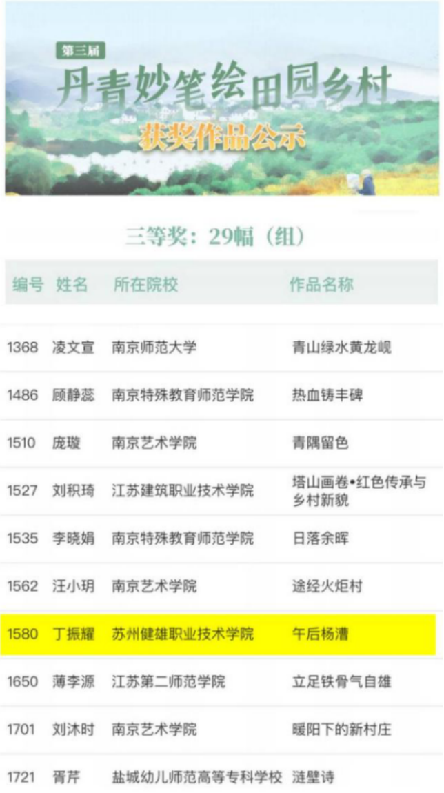 12月4日,由江苏省委宣传部、省住房和城乡建设厅、省教育厅、团省委、省文联共同举办的第三届“丹青妙笔绘田园乡村”活动复评成绩揭晓。经过激烈角逐,由我校艺术设计学院周颖老师指导的2023级广告艺术设计专业丁振耀同学创作的绘画作品《午后杨漕》获得三等奖,创造了我校参加此赛项以来的最好成绩。