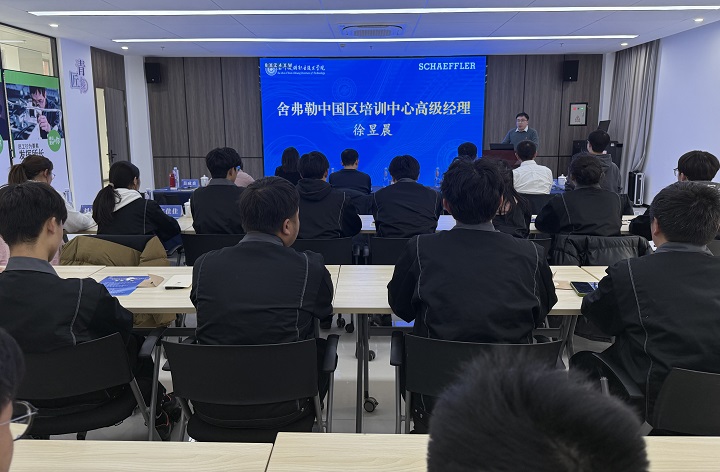 徐昱晨在致辞中感谢学院对舍弗勒双元制学徒项目的重视和支持,与同学们分享了舍弗勒集团的今年发展情况、未来发展趋势,企业对未来人才的期待,以及学徒职业发展的可持续性因素,希望同学们保持好奇、持续学习、注重积累,为自身的发展打好结实基础。